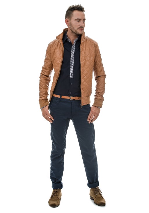 Brown works excellently not only as a colour of trousers. Classic brown leather jackets have got also a high fashion potential. Perfectly fitted with a small stand-up collar and quilted inserts. Such brown jackets fit best to vintage stylings with a shirt or a T-shirt and classic straight jeans. If you want to look unique, match your navy blue total look with such a jacket.
