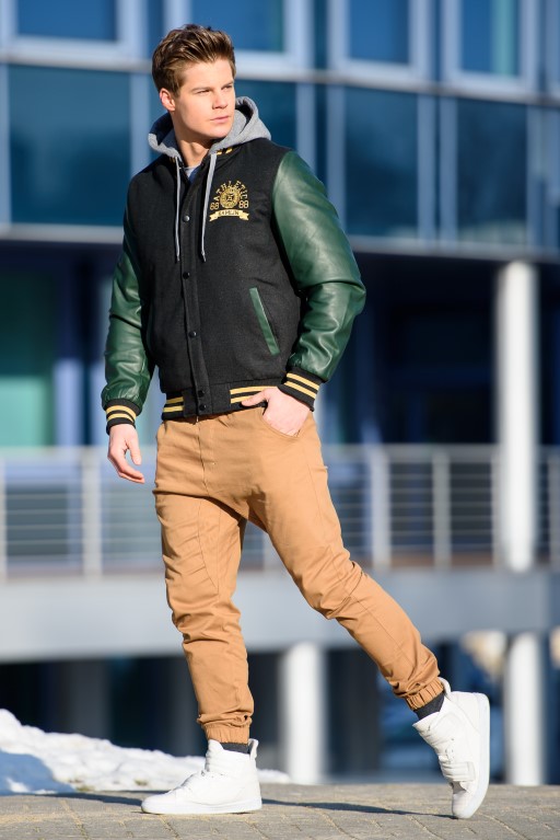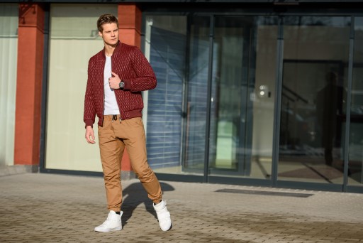 Try beige men's chino trousers with a checked pattern – it's another way to get a sensational look. It can be a sporty bomber jacket with contrasting sleeves or short quilted lightweight jacket, e.g. red or claret.