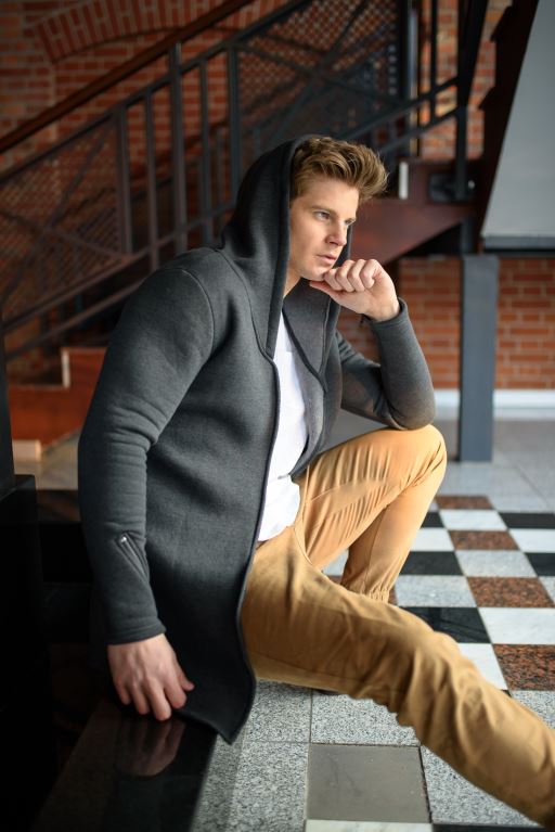 A longline men’s hoodie is a fantastic choice for many occasions. This universal design looks best in soft and toned colours. The best colour is black, navy blue, beige and all shades of grey. Pay attention to colours but also to its texture. Plain hoodies are good among casual stylings. However, if you want to replace a jumper, place a bet on a marled hoodie in the shades of grey, beige, black or even green. When buying a hoodie, take a look at its label and find the information about the fabric. Sweats and hoodies made from cotton, or with the small dose of other fabrics are the best choice. They are usually warm but also pleasant in touch.