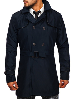 Men's Double-breasted Trench Coat with High Collar and Belt Navy Blue Bolf 0001