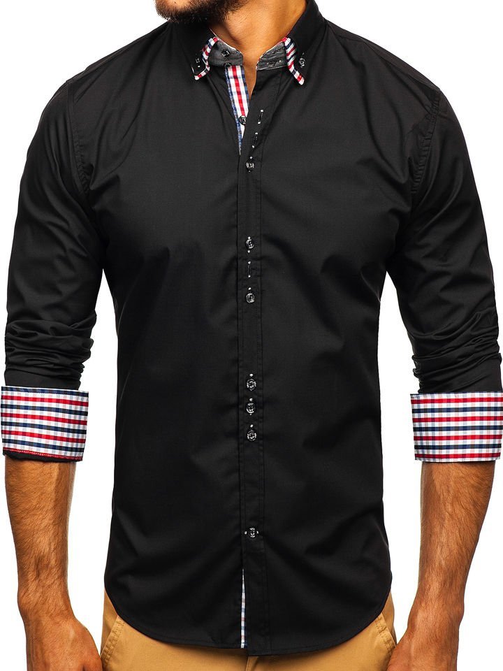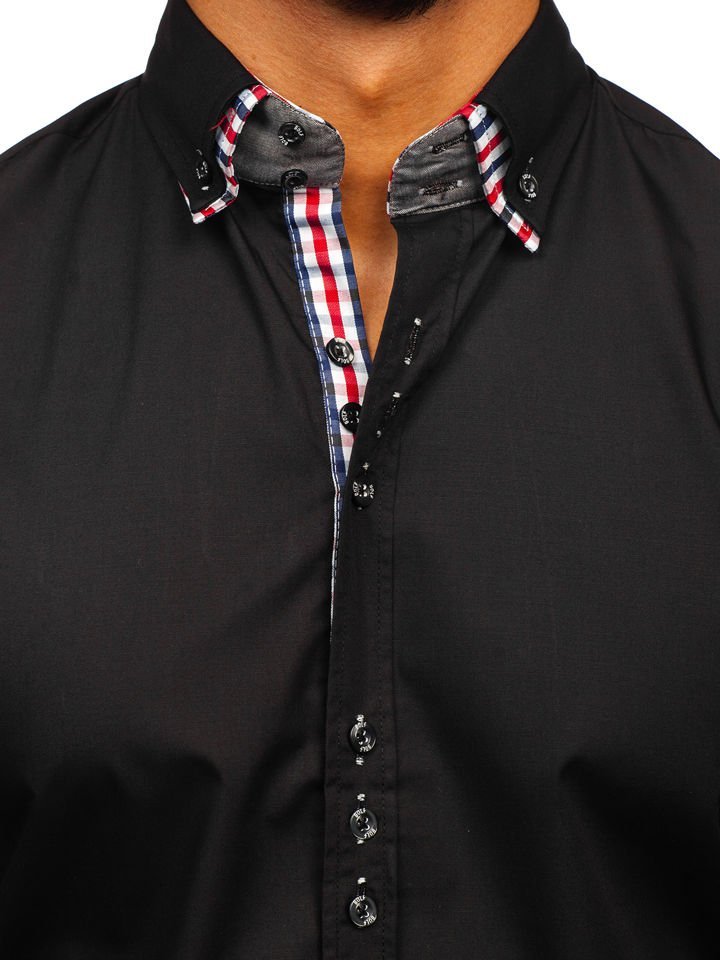Black men's elegant long sleeve shirt 0926. It is equipped with a button-down collar, adjustable cuffs and round bottom. The presented shirt has got an interested pattern. It is also on the button line and at the collar. This slim fit shirt underlines the silhoutte. It's a great alternative to a classic shirt.A men's shirt adds up style to every outfit. Feel free to wear it with a blazer, chinos or jeans.