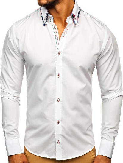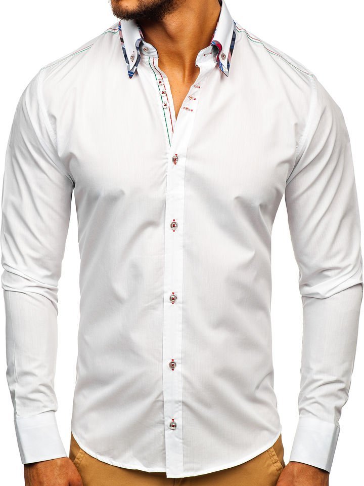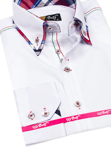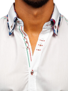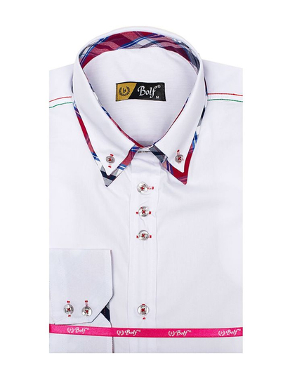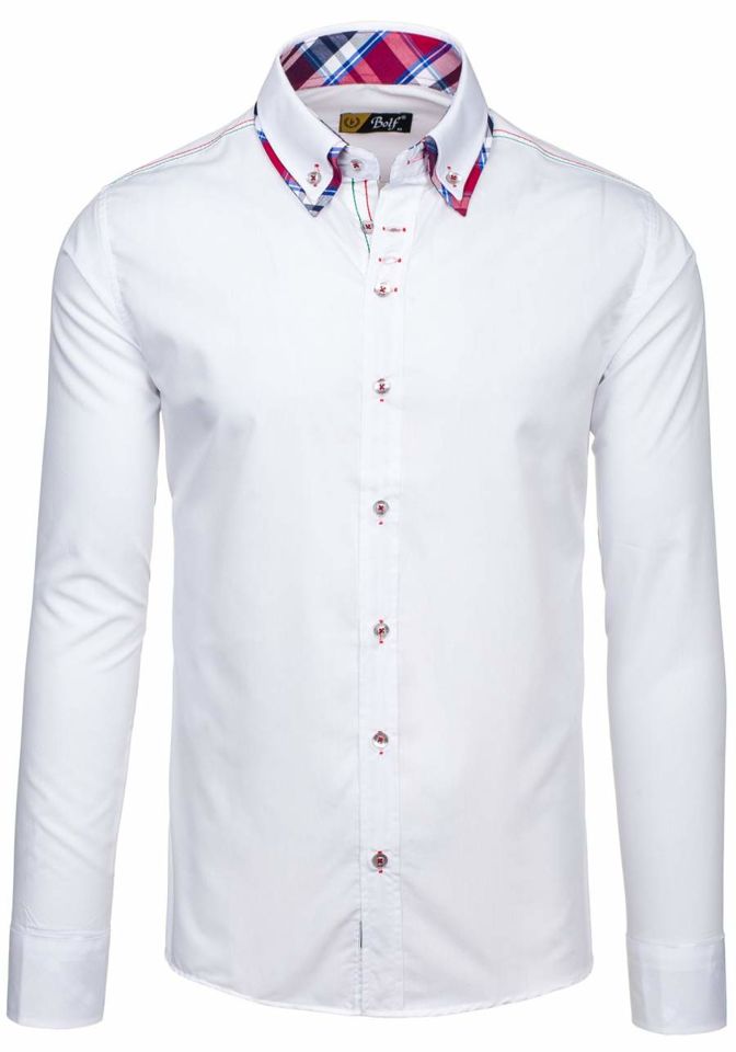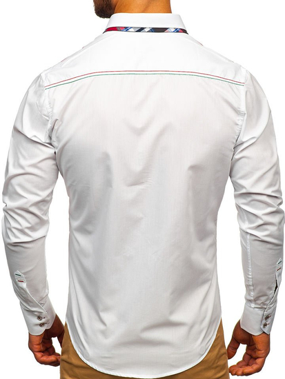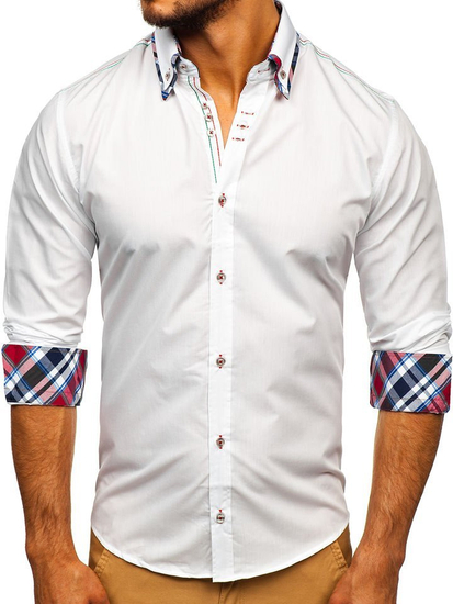 Casual white long sleeve shirt from the Bolf collection. It provides a comfortable fit. It has stylish details. The stitching and the checkered accent on the double collar are immediately eye-catching. The presented model is slim fit and looks great in different stylings.