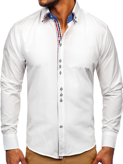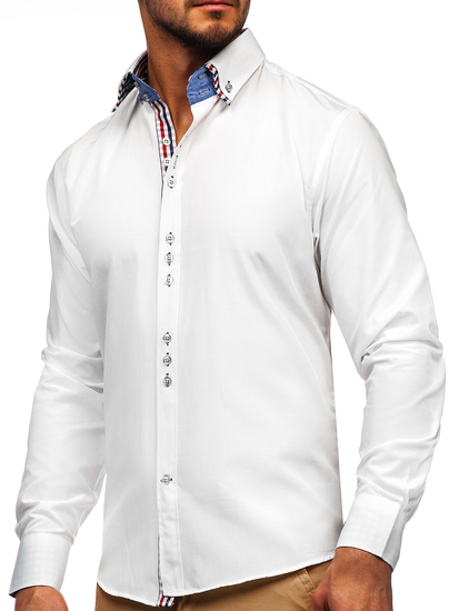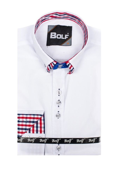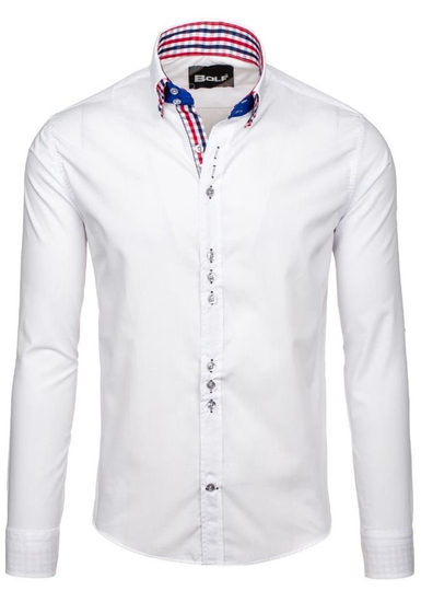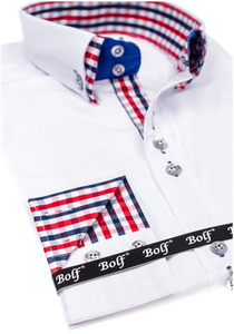 Exceptional white long-sleeved slim fit shirt from the Bolf collection. It has a beautiful color, very impressive, double button down collar and checkered inserts. This shirt slims, wears great, is very comfortable. Combine it with a jacket, jeans or chinos.
