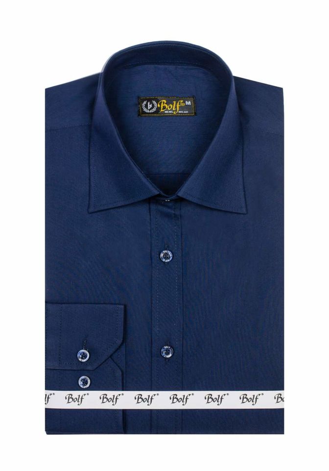 Elegant navy blue men's long sleeve shirt 1703 from the Bolf collection. The presented model comes in different colours. Plain men's shirts are recommended for fans of minimalism and classic elegance in fashion. It provides great comfort and fitting. A definite must-have in the wardrobe of a conscious businessman. The design is straight and fits to various stylings. Shirt with a slim fit cut, buttoned, has a practical rounded hem. The sleeves are finished with wide, adjustable cuffs that are fastened with one button. It has a classic collar with short lapels. It will surely meet your expectations regardless of the colour. Choose from many beautiful colours. Shirts will work in many formal and semi-formal compositions, in all circumstances. Business meeting? Date? Party? For each of these occasions, it is worth wearing a plain Bolf shirt. This model can be matched with jeans, joggers, a bomber jacket or a classic leather jacket. Wear it with chinos, a blazer or a suit. Add a classic bow tie or a tie. The Bolf 1703 shirt is the flagship product of the brand. It is also one of the Bolf sales hits, for years it has been in the TOP 10 shopping choices of our customers who are willing to come back for new color versions of the product. Exceptionally good price and great workmanship are other advantages of the shirt.