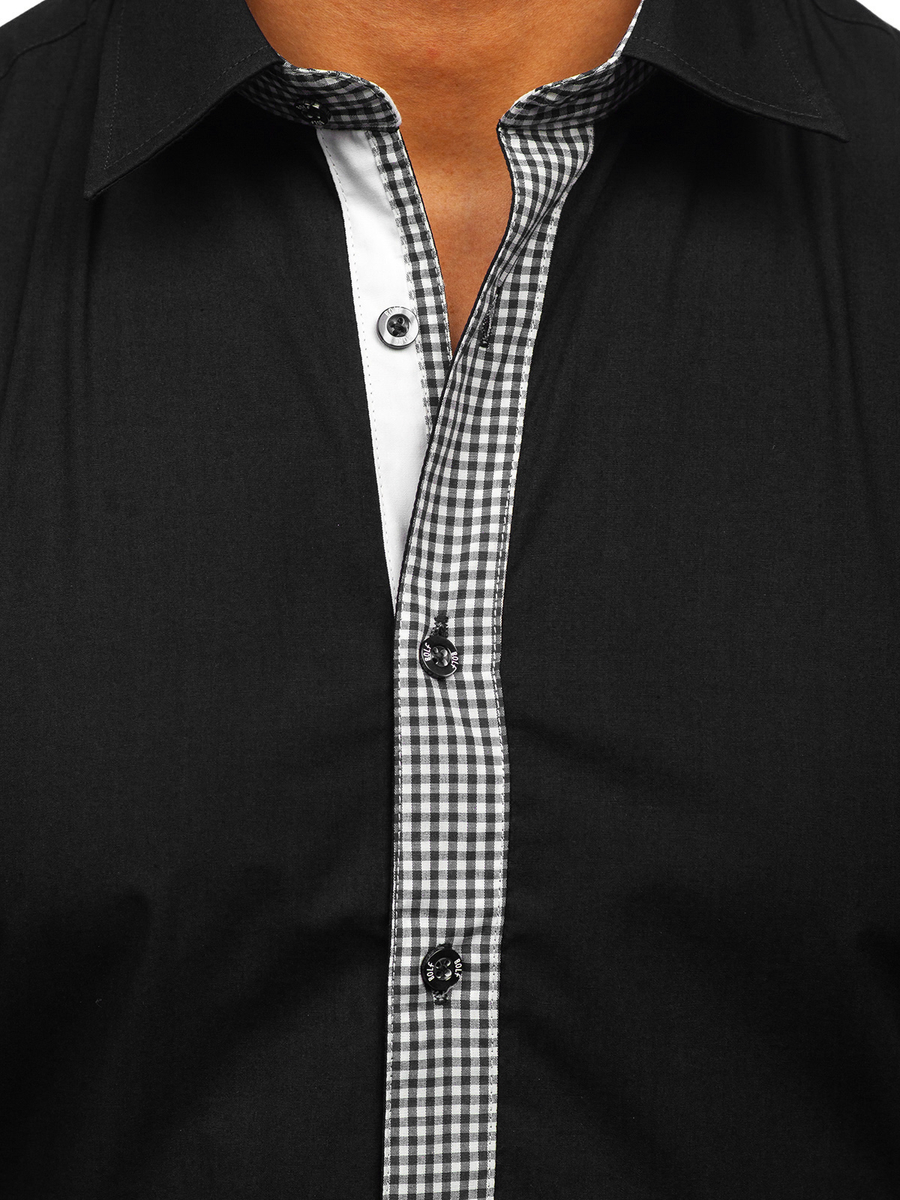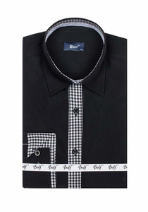 Original black men's slim fit shirt from the Bolf collection with an eye-catching button strip. The presented model provides great comfort and fits well. Wear it with jeans to create a comfy look. Match it also with business chino trousers.