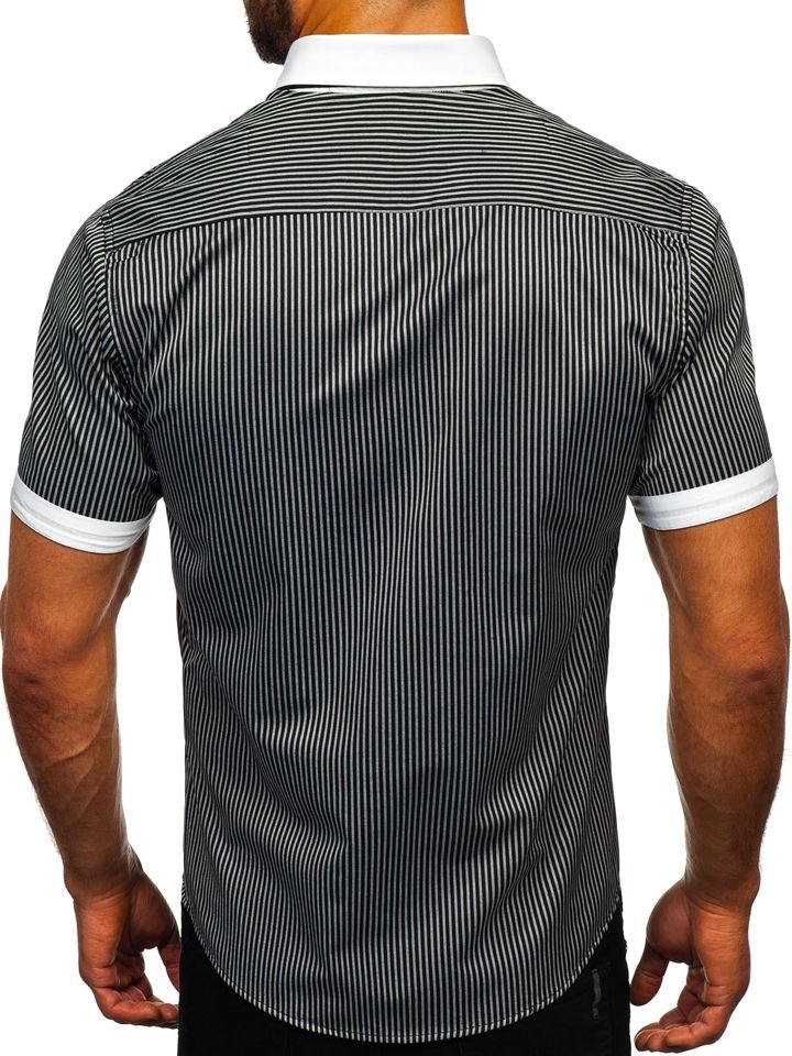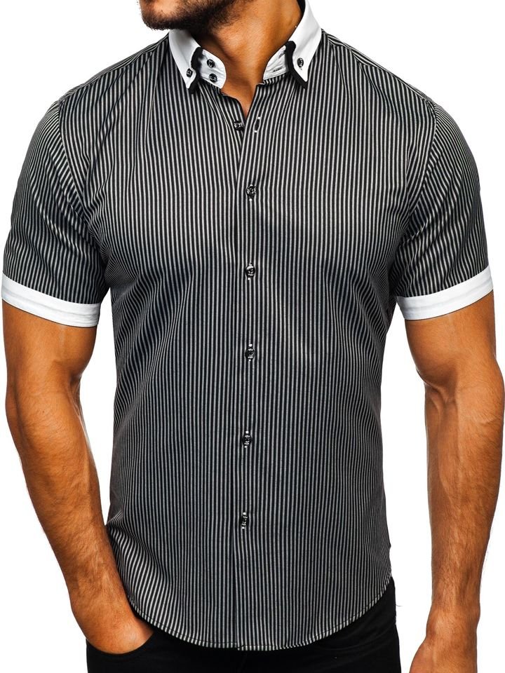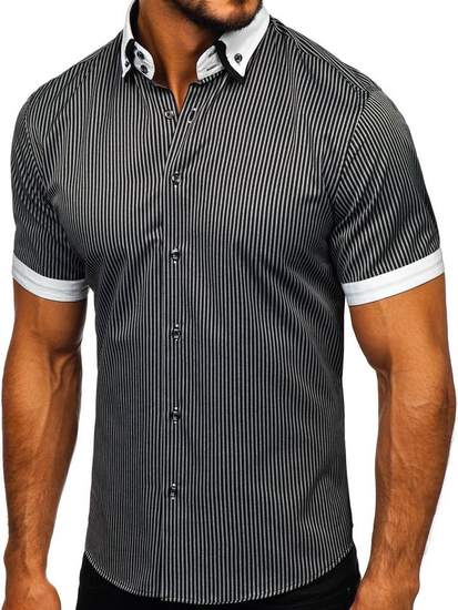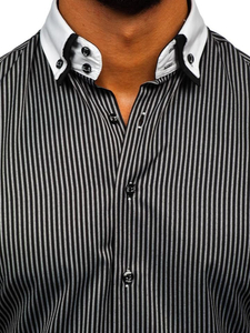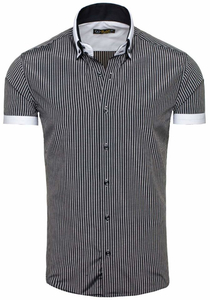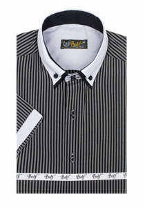 Comfortable black men's slim fit shirt from the Bolf collection. Suitable for informal styles, reliable in spring and summer. The presented model has delicate stripes and a white collar. It looks nice with jeans, sneakers, or a loose cardigan.