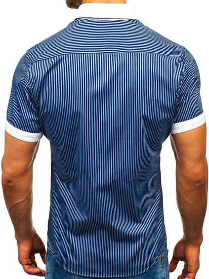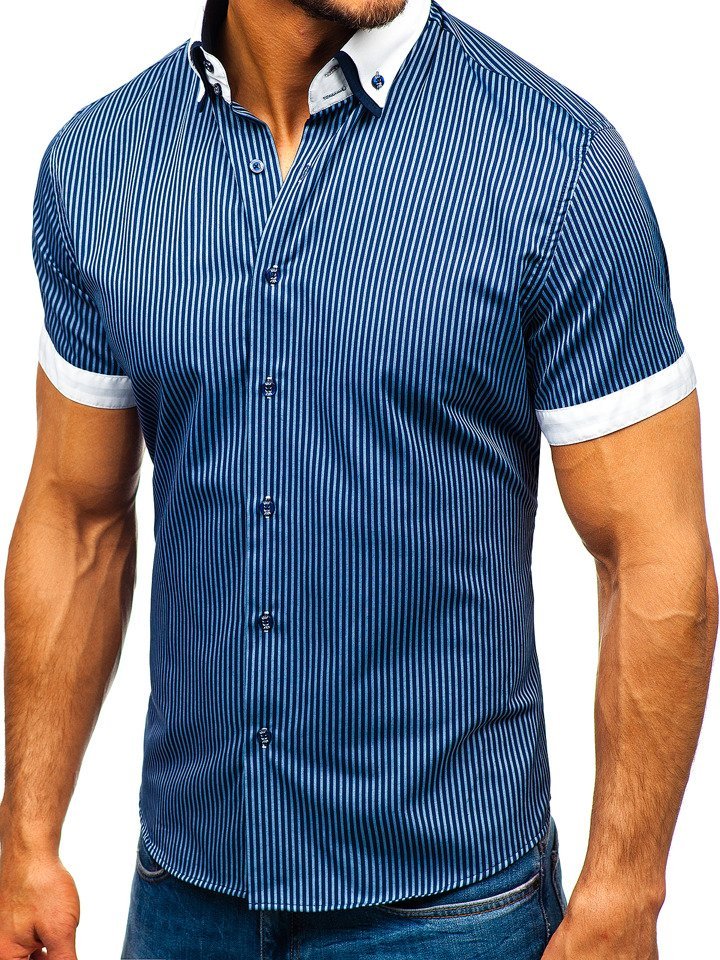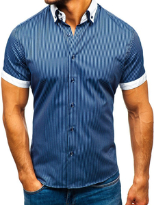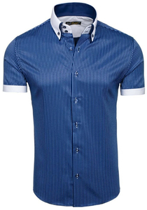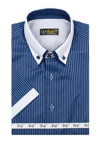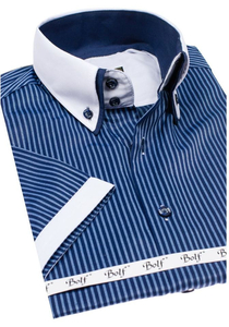 Comfortable navy blue men's slim fit shirt from the Bolf collection. Suitable for informal styles, reliable in spring and summer. The presented model has delicate stripes and a white collar. It looks nice with jeans, sneakers, or a loose cardigan.