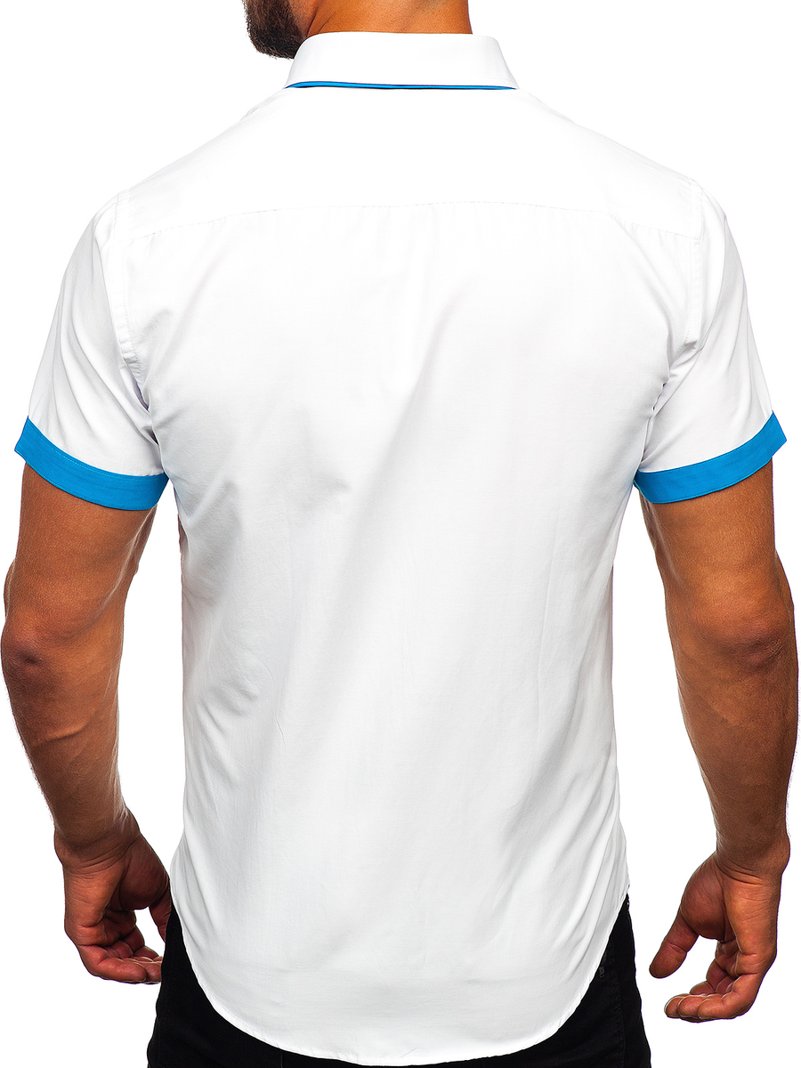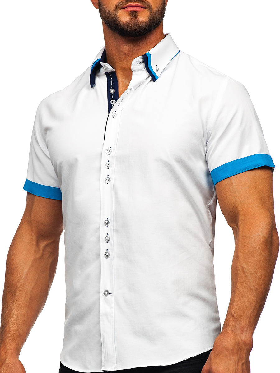 Brand new arrival! White short sleeve shirt with a triple button down collar from the Bolf collection. There are nice cuffs and a button strip. The presented model is slim fit and looks best together with shorts and white shoes.
