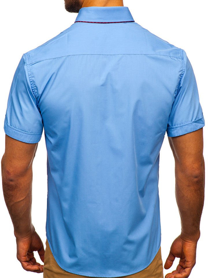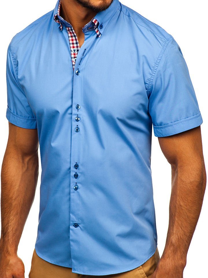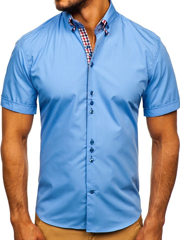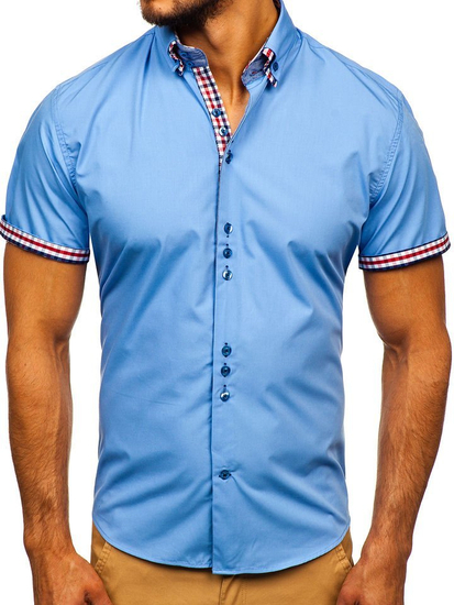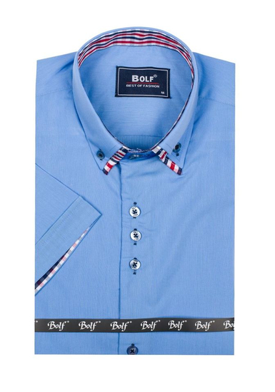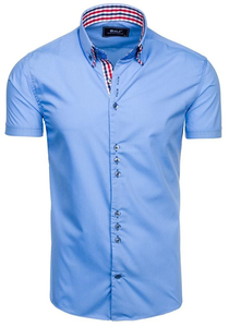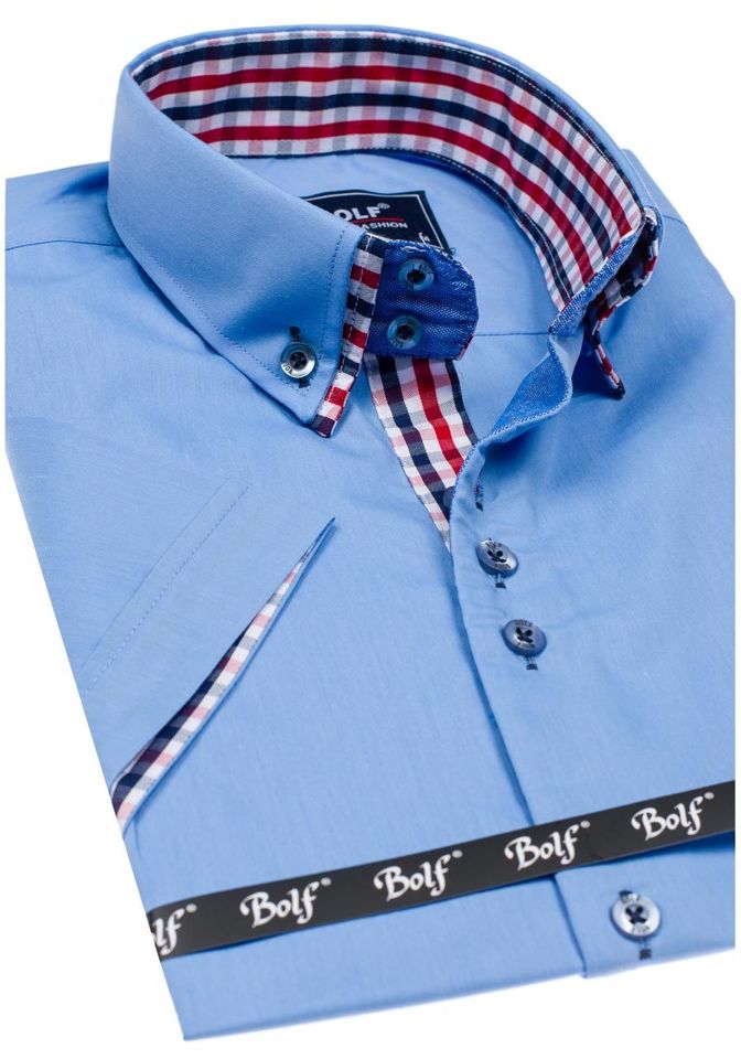 Impressive and versatile sky blue men's short sleeve shirt from the Bolf collection. You'll love the slim fit, but it's the details that count. The informal collar and checked inserts immediately catch the eye. The presented model looks best together with chinos. Also wear it with summer shorts.
