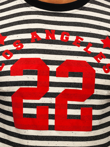 Striped men's sweatshirt by Bolf is the perfect offer for the gym and impressive element of streetwear outfit. Universal cut in toned colours. Black and white stripes with red prints creates an interesting effect. It fits with jeans, shorts or cargo pants. You must match it with the most trendy red shoes.