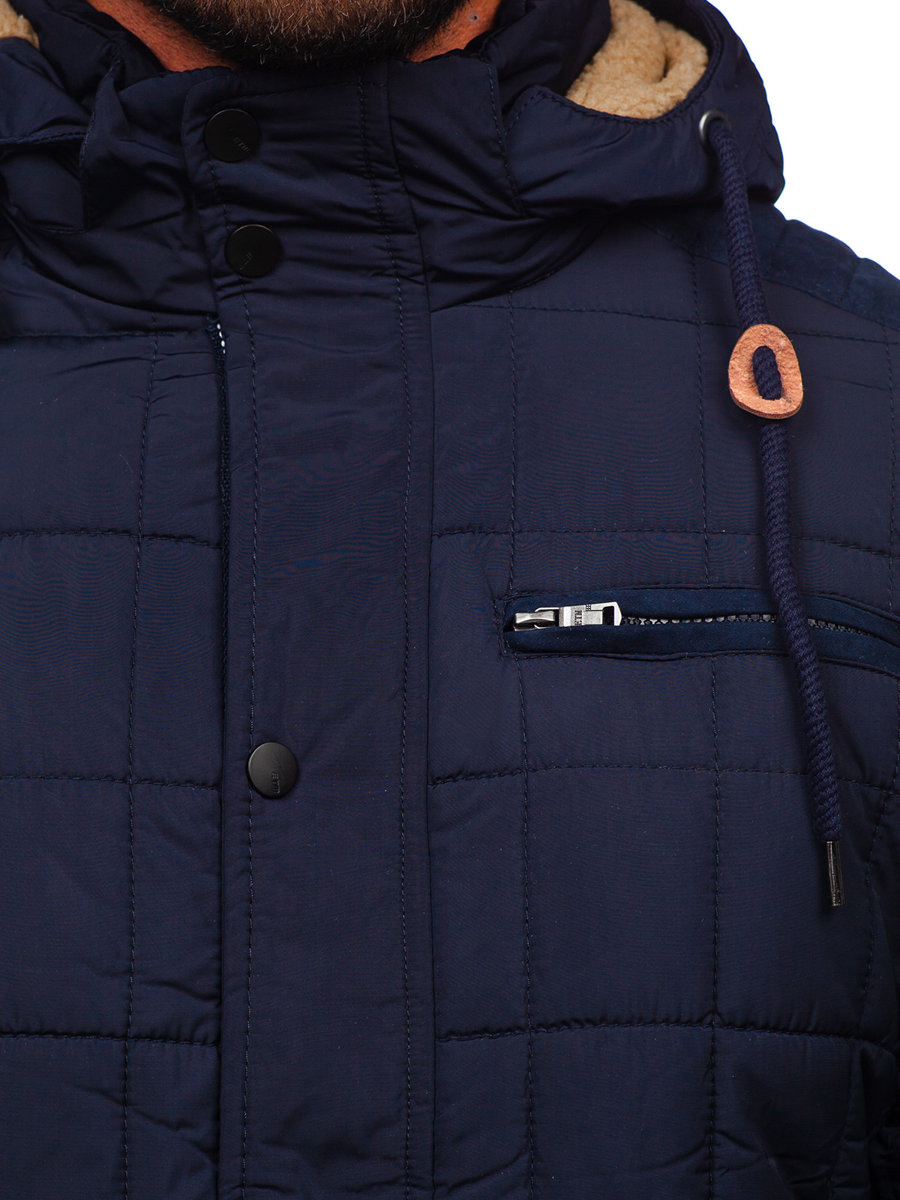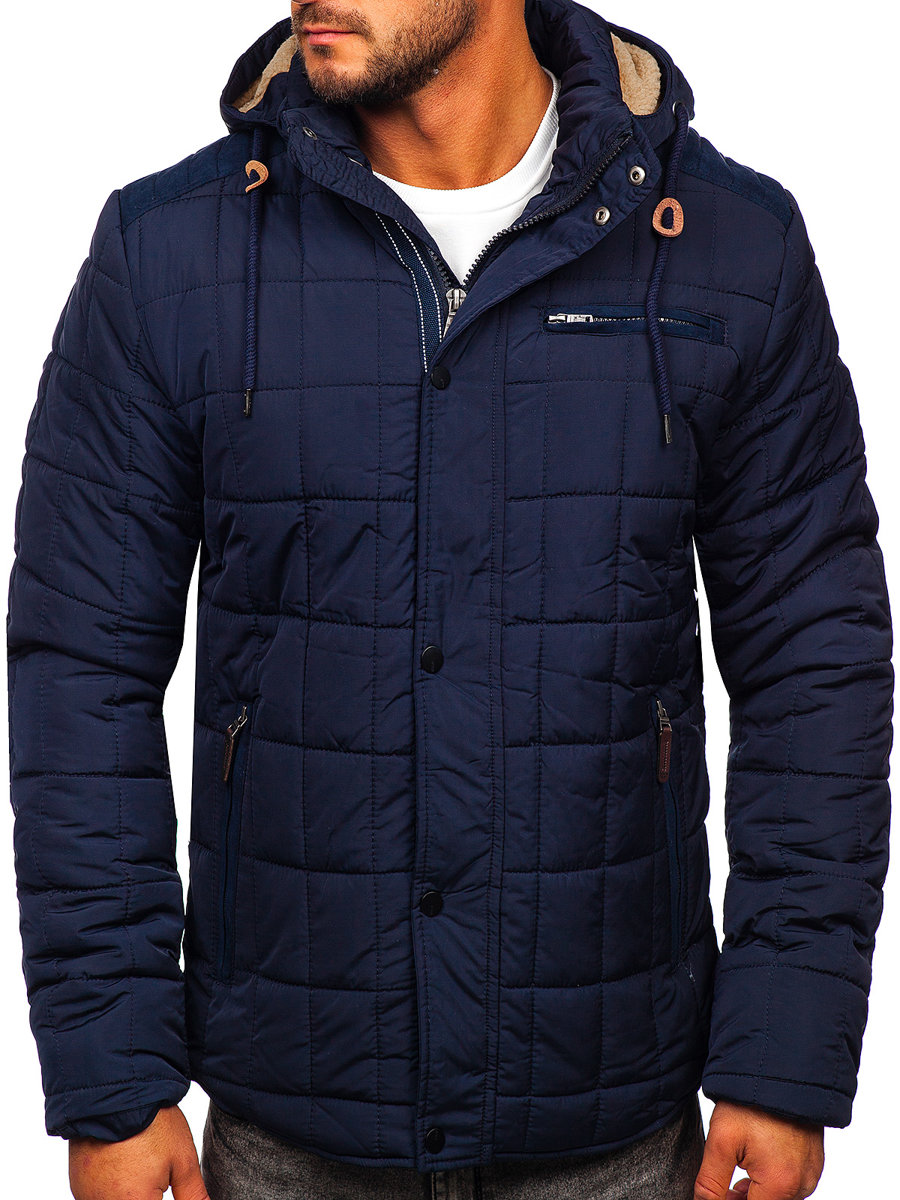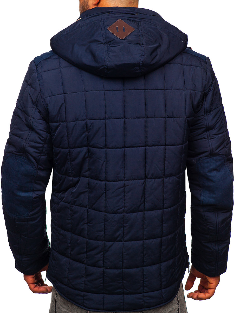 Perfect navy blue men's winter jacket 1672 from the Bolf collection. A jacket in a classic, subdued color will find its place in every men's wardrobe. A quilted jacket is a must have in every man's wardrobe. The product has an insulated, adjustable and detachable hood, which perfectly protects against frost and wind. The hood is sewn with the manufacturer's designer logo, which adds character to the product. A stand-up collar also perfectly protects the neck from low temperatures. The jacket can be conveniently closed with a zipper and press studs. Stylish elements are fashionable, quilted inserts on the shoulders and patches on the elbows. They add a unique character to the jacket. Comfortable and functional pockets are a practical element of the product. The jacket has three outside pockets and one inside pocket. You can safely store the necessary small items or documents in them. The outer pockets are also closed with a zipper. The bottom of the jacket is regulated with zippers, and the sleeves are finished with welts on the inside. This provides protection against the cold.The product is intended for all supporters of urban styling. Subdued color and universal cut mean that the jacket will serve you for many seasons and will never go out of fashion. Quilted patterns have been triumphant in men's fashion for decades. The product will be a great choice for a spontaneous meeting with friends, a walk with a loved one or a city trip. This type of jacket is always eye-catching and will make you stand out from the crowd. The product can be matched to both classic and more original styles. The jacket will harmonize perfectly with pastel and darker garments. The model (182 cm, 82 kg) is wearing a size XL, while the jacket can be purchased in a different size. You will be able to adjust it perfectly to your figure. The product is made of 100% polyester. It works well with jeans, chinos or joggers. You can put a shirt or a hoodie underneath.