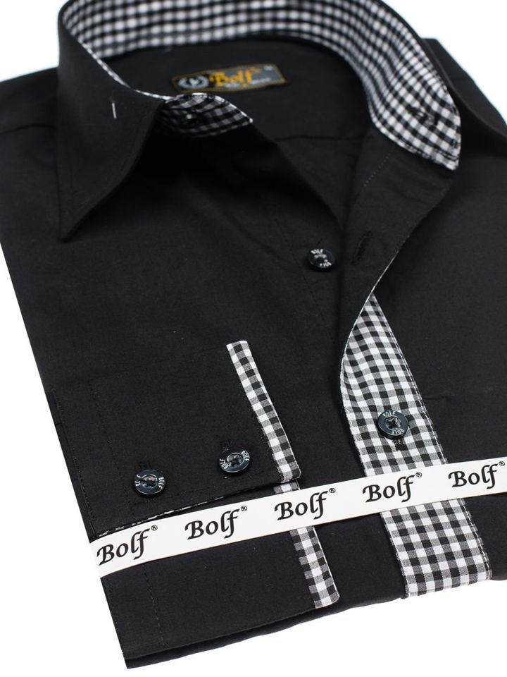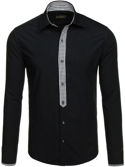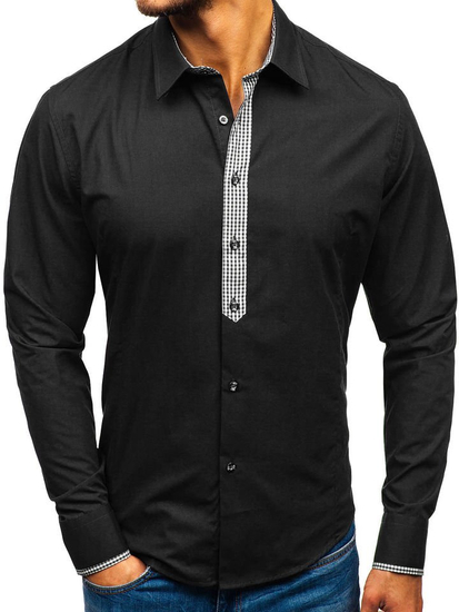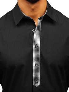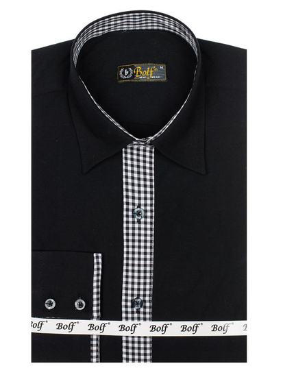 Black men's shirts from the Bolf collection. Perfect for every day and to work. This model has got expressive stylish inserts in a checked pattern. It goes well with a blazer, jeans or with colourful chinos.