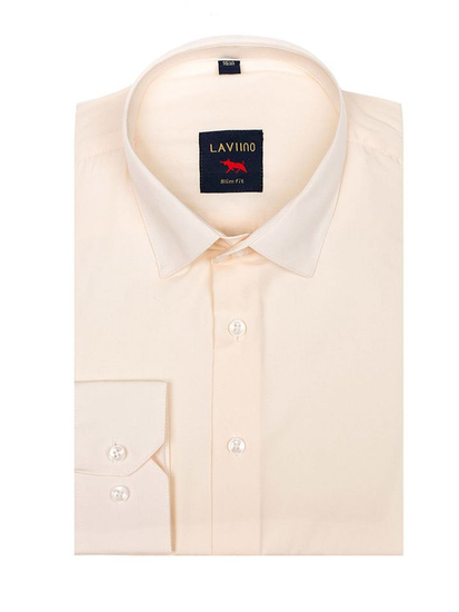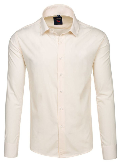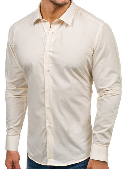 Universal ecru men's slim fit long-sleeved shirt from Bolf. It's plain, minimalistic and has got an elegant collar. This ecru men's shirt works great in elegant stylings and can easily juice up a look with chinos or jeans.