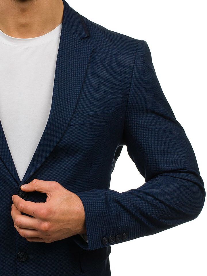 Very elegant navy blue men's slim fit blazer from the Bolf collection. It has got a breast pocket, a decorative edge at the collar and pockets with a flap. The presented elegant men's blazer looks nice together with a shirt and chino trousers.
