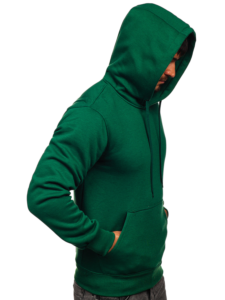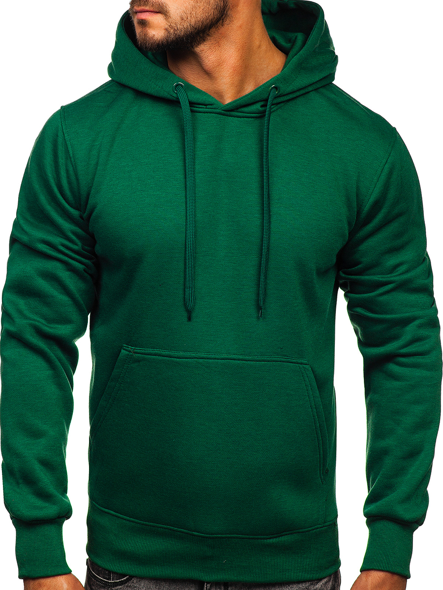 Great dark green men's hoodie 2009 from the Bolf collection. It has an adjustable hood and a practical kangaroo pocket at the front. The sport look is provided by the straight design. There is a drawstring-adjustable waist and bottom. It is made of soft, smooth sweatshirt fabric in a uniform color. This model is distinguished by rich colors, it can be found in more than twenty color variants, thanks to which it easily fits into many outfits. Wear it all year long. On many occasions. Shopping? Relax? Even for a spontaneous date, it will be appropriate. The product is perfect for everyday wear, it is a must-have item in any stylish men's wardrobe. The stylish colour really boosts up the outfit. It works well with jeans, cargo trousers or joggers. Match it with sweatpants or a lightweight jacket. Wear it to the gym or on an outdoor workout. This model is often chosen by buyers. Check out this model in the reviews of influencers and IG. It attracts with great workmanship and a good price compared to the competition. The sweatshirt also has its counterpart in the women's version, which also breaks popularity records.