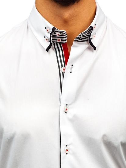 Original casual white and black men's slim fit shirt from the Bolf collection. It's very comfy, well-fitted and has got a double button down collar. The presented model fits to various stylings. Feel free to wear it with a sweatshirt or a leather jacket.