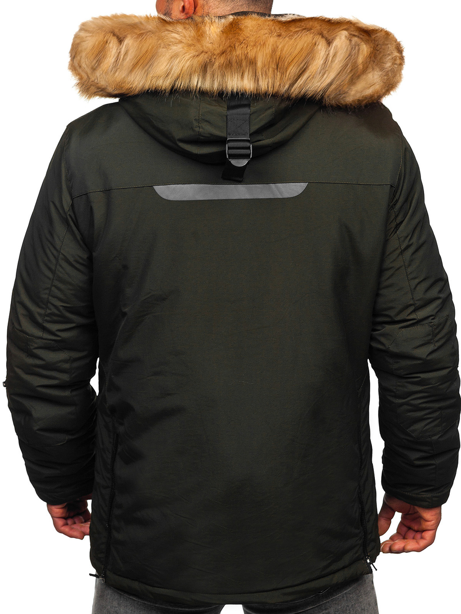 Warm and practical green winter jacket from the Bolf collection. It has got 6 large pockets, a detachable hood and fur. It is designed on cold days, has got adjustable cuffs, a double fastening and a drawcord on the inside. The presented model works well with a thick jumper, jeans and boots.