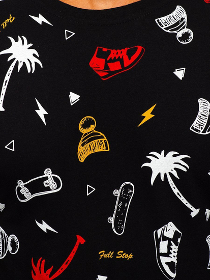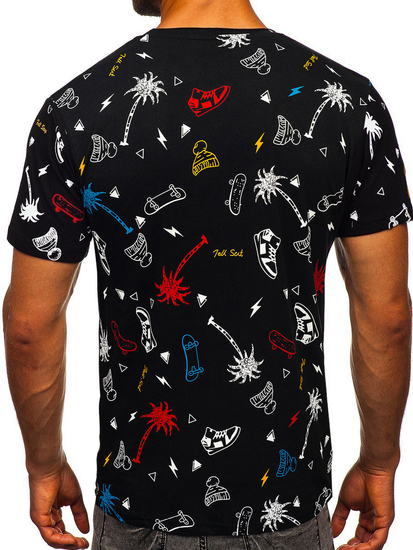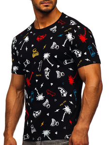 Universal black men's T-shirt from the Bolf collection. It's printed in a tiny pattern with a skateboard, palm tree, cap and sneakers theme. The presented model should be worn in casual stylings with jeans or joggers.