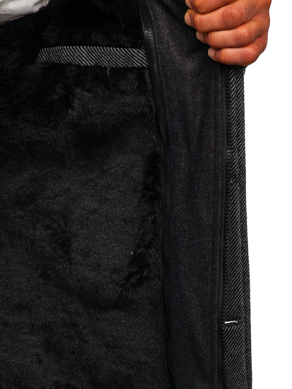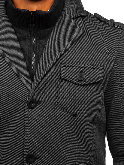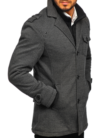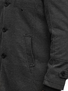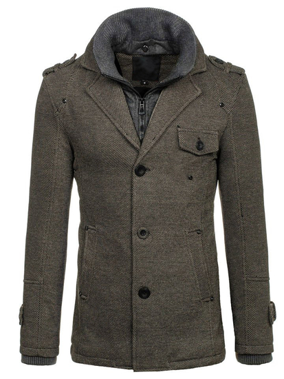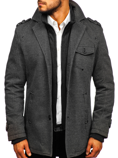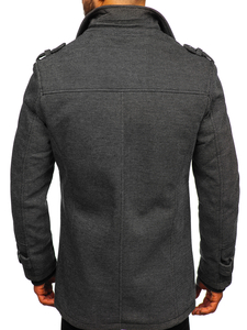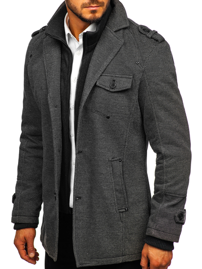 Very elegant grey men's single-breasted coat. It's insulated, has got a double fastening, an additional collar and epaulets at the shoulders and sleeves. The presented model from the Bolf collection looks good in various stylings. Feel free to wear it with jeans and a jumper.