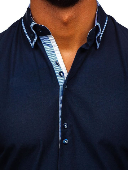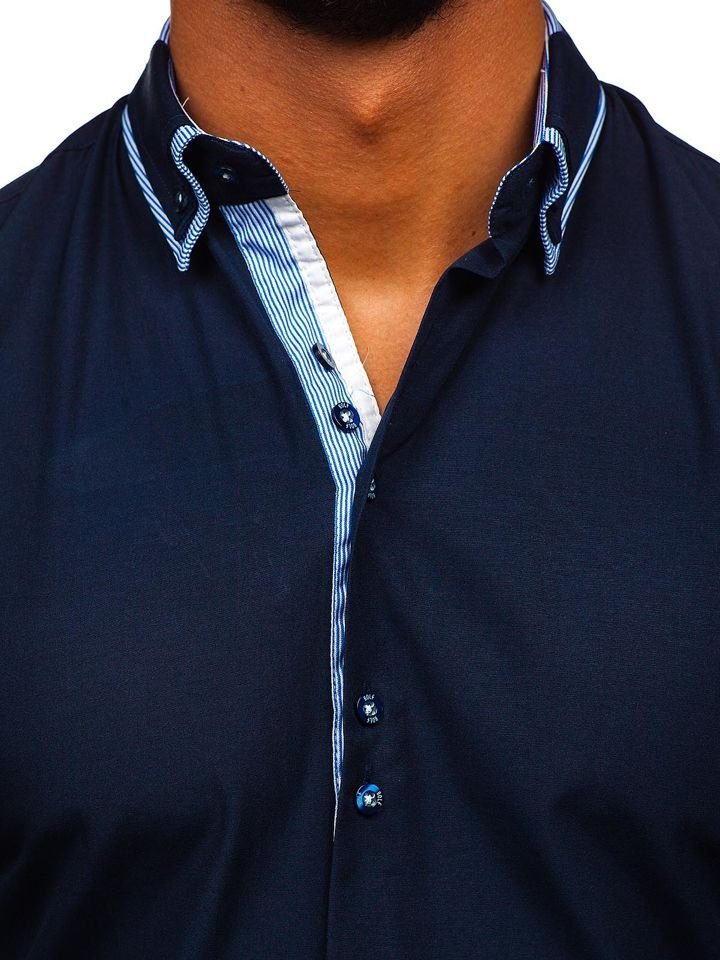 Elegant navy blue men's shirt with a double button down collar from the Bolf collection. There are striped inserts. The presented model is slim fit, underlines the silhouette and shoulders. Stylish match up with jeans and low shoes.