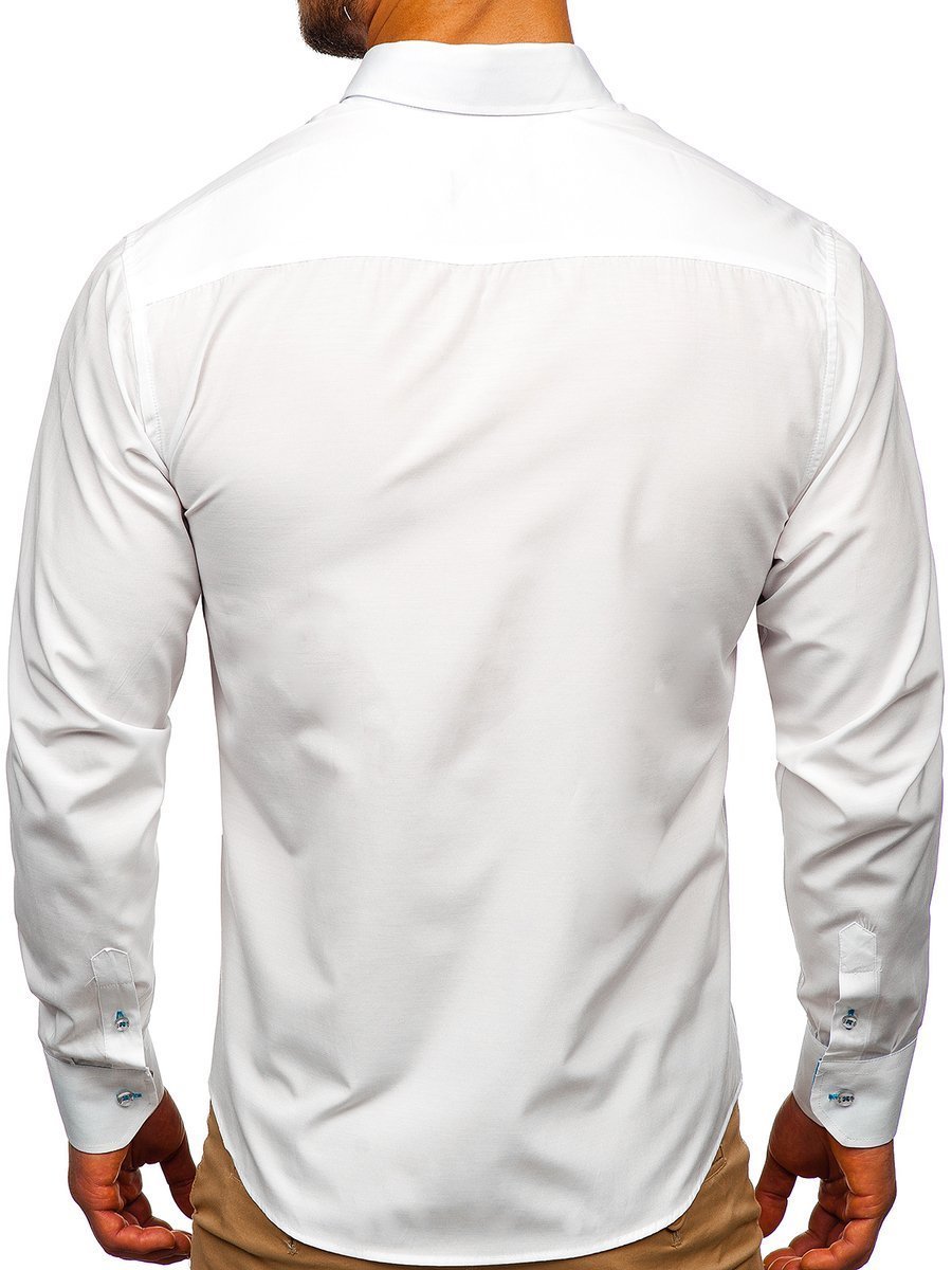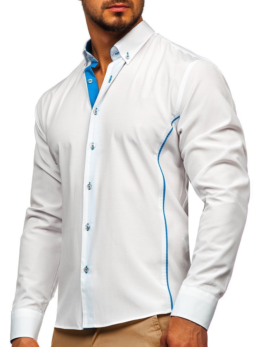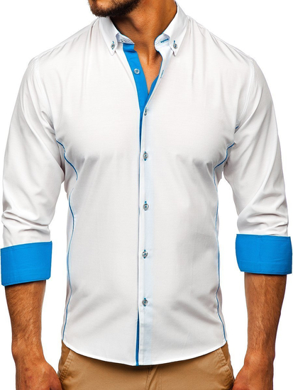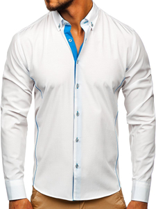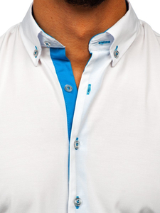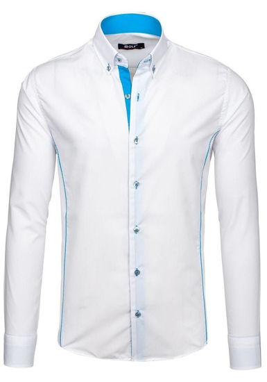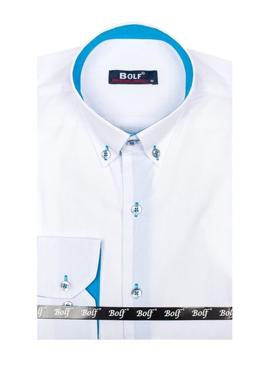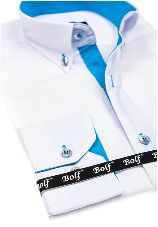 Fashionable white and sky blue men's shirt from the Bolf collection. Slim fit design slims the silhouette and blue inserts additionally emphasize it. The presented model has got a button down collar. It is suitable to various stylings. Feel free to match it also with a blazer, jeans or a leather jacket.