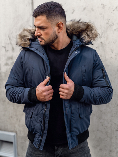 Perfect navy blue winter jacket with spacious pockets and a decorative furry hood from the Bolf collection. It's highly comfortable and has got snap-pockets. The presented model fits to all casual stylings. Wear it with a jumper or a sweatshirt and set with jeans or joggers.