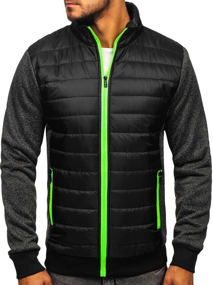 Black men's quilted transitional jacket for chilly days. The characteristic features of this jacket are horizontal quiltings and neon zippers. The sport look is provided by the straight design, ribbed sleeves and heathered inserts.