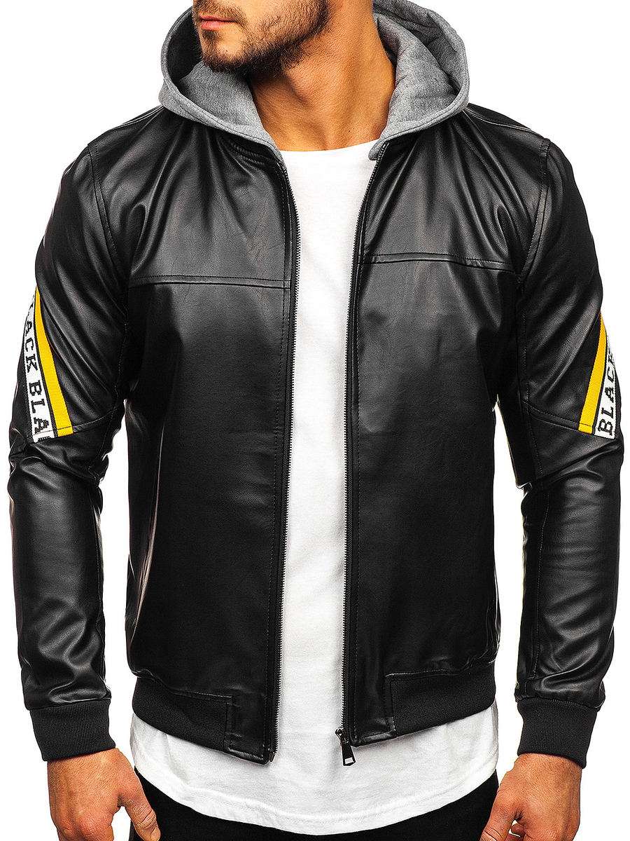 Men's Hooded Leather Jacket Black-Yellow Bolf HY614