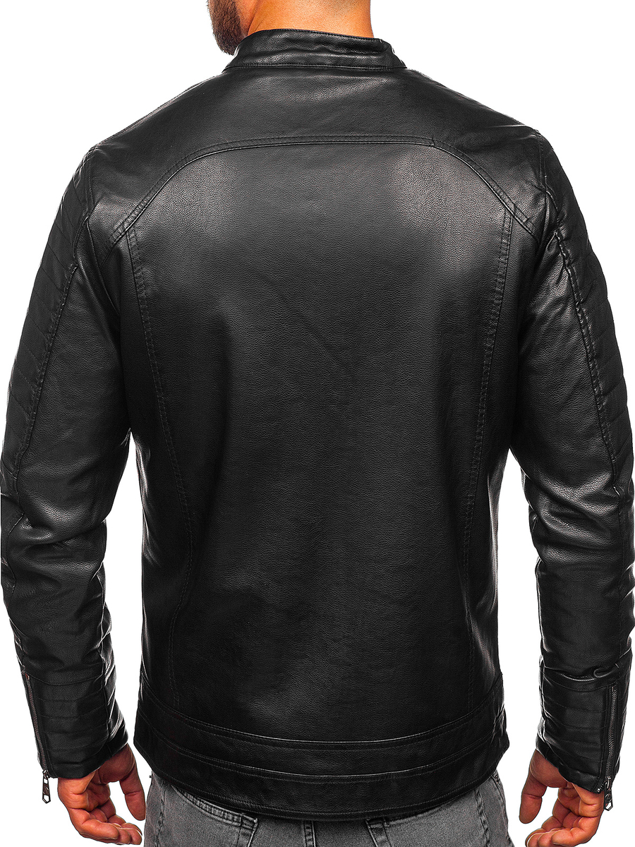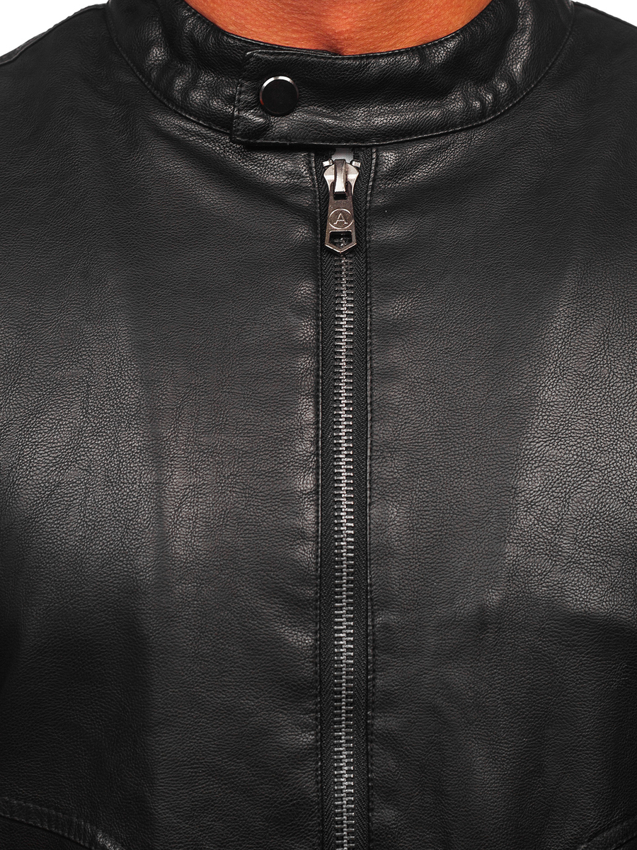 Fantastic black warm men's leather biker jacket 92531 from the Bolf collection. The product is made entirely of ecological leather. The jacket has an insulated lining, which makes it perfect also on cold days. It is fastened with a convenient zipper. The product has a stand-up collar, which is fastened with a snap. The jacket has two comfortable and roomy pockets, which are also fastened with a zipper, and one internal pocket without fastening. The bottom and sleeves of the jacket are straight, which makes the jacket look simple and elegant. The product's sleeves are adjustable with a zipper, making it easy and comfortable to put on. The product is perfectly tailored to more casual occasions, such as a walk, a city trip or a date. The jacket, thanks to its elegant and stylish cut, is perfect for every occasion. Thanks to the insulated lining, it is suitable for cool, autumn and winter evenings. The product is perfect for a long, autumn walk, both in the city and in nature. The jacket looks great and perfectly protects against frost and rain. You will look elegant in any situation, both during meetings with friends, as well as more formal and official occasions. The classic cut of the product means that the jacket will never go out of fashion. It can be combined with both less and more formal stylizations. Black color will be a perfect match for both light and dark garments. Quilted ornaments on the sleeves add character to the jacket. Your chosen one will be delighted with your stylization, which will be emphasized by a black, elegant jacket. The product is perfectly combined with jeans, a men's shirt, a sweater, a long sleeve top and joggers, therefore it should be in every men's wardrobe. It is a must have for every man, because the product can be combined with any outfit and any color. The jacket consists of 50% polyurethane, 40% polyester and 10% viscose, which makes it environmentally friendly and safe. The materials of the product make it comfortable and stretchy.