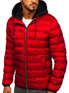 Red men's winter jacket 5332 from the Bolf collection. It has got a zip fastening and is suitable to casual and sport stylings. There is a detachable hood. It has a stand up collar underneath. The jacket has two outside snap pockets. The sleeves are ribbed. It can be matched with various stylings. Match it with different colours. Feel free to match it with sweatpants, jeans, joggers.