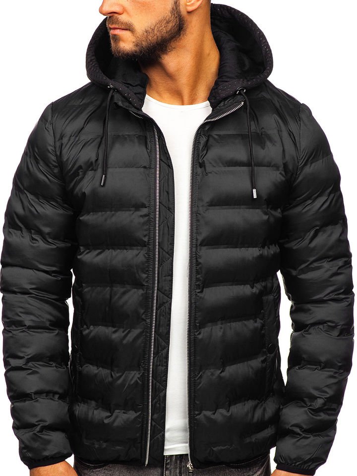 Black men's winter jacket 5332 from the Bolf collection. It has got a zip fastening and is suitable to casual and sport stylings. There is a detachable hood. It has a stand up collar underneath. The jacket has two outside snap pockets. The sleeves are ribbed. It can be matched with various stylings. Match it with different colours. Feel free to match it with sweatpants, jeans, joggers.