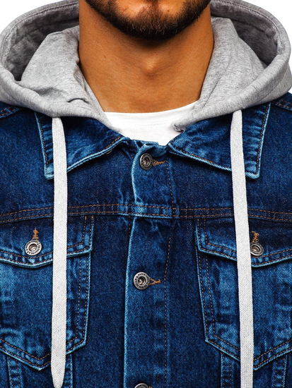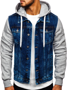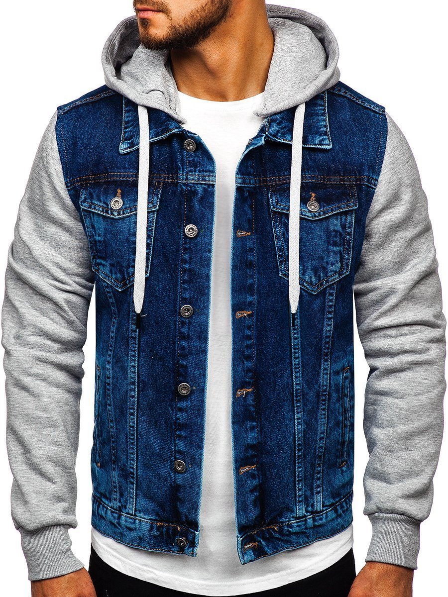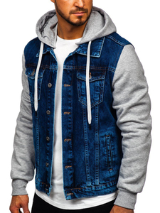 Universal navy blue men's buttoned denim jacket with a hood 211902 from the Bolf collection. The product has two breast pockets with a flap, which are fastened with a button. They are perfect for storing a phone or various small things. The two lower pockets are on the outside of the jacket and have no fasteners. The sleeves of the jacket are finished with elastic cuffs, making them easy to roll up. The hood of the product is made of fabric. A big advantage of the jacket is the possibility of detaching the hood, which can add a more elegant and formal character to the jacket. The hood can be adjusted with a drawstring, which is useful on windy or rainy days. The sleeves and the hood are made of fabric. The gray color of the hood and sleeves contrasts well with the denim style of the jacket.The jacket is designed for fans of everyday style. It is perfect for meeting friends, walking or going out into the city. The versatility of the product will make you feel both comfortable and stylish in it. Buttons add style to the jacket. At the bottom of the jacket there are stylish fasteners, also with buttons. Along the jacket and on the shoulders, there are tasteful sewings that add character to the jacket. The jacket will be perfect for both more subdued and bolder outfits. The universal cut makes the jacket perfect for autumn evenings. You can also wear it in spring and on cooler summer evenings. This product is a must in every man's wardrobe, it will make you look stylish and elegant. Thanks to the possibility of choosing a color variant, it can be adapted to any everyday styling. The subdued color of the jacket will allow it to match a bright and subdued outfit. Feel free to match it with a long sleeve top, joggers, jeans or a sweater. Match it with a hoodie or a shirt. The product is made of 100% cotton, which ensures warmth on cold days.