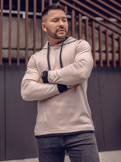 Eye-catching beige men's hoodie 145380 from the Bolf collection. It is available in many colors, which gives a wide range of possibilities in creating everyday stylizations. A sweatshirt in a fashionable color is the basis of a good ourfit. It is put on over the head and has an adjustable hood that provides protection against wind and cold. The bottom and sleeves are finished with a contrasting trim. A product of this type is a must have for fans of sports style. Provides comfort while walking, jogging or training. The sweatshirt is made of 100% cotton, making it incredibly comfortable and pleasant to the touch. Together with jeans or joggers it will create an interesting outfit. For cooler evenings, it will also be great in combination with a bomber jacket.