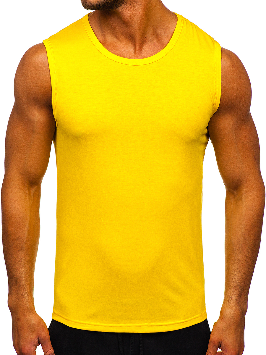 Classic plain yellow tank top 99001 from the Bolf collection. The presented model comes in many colours. It is made of a soft high-quality breathable material. It's perfectly fitted and underlines the silhouette. It has got a crew neckline with an elastic trim. It's basic and fits to every styling.It's a must have in the wardrobe of every man. It works well with jeans, cargo trousers or joggers. Wear it also with a zip hoodie or a bomber jacket.