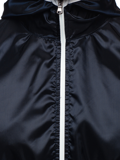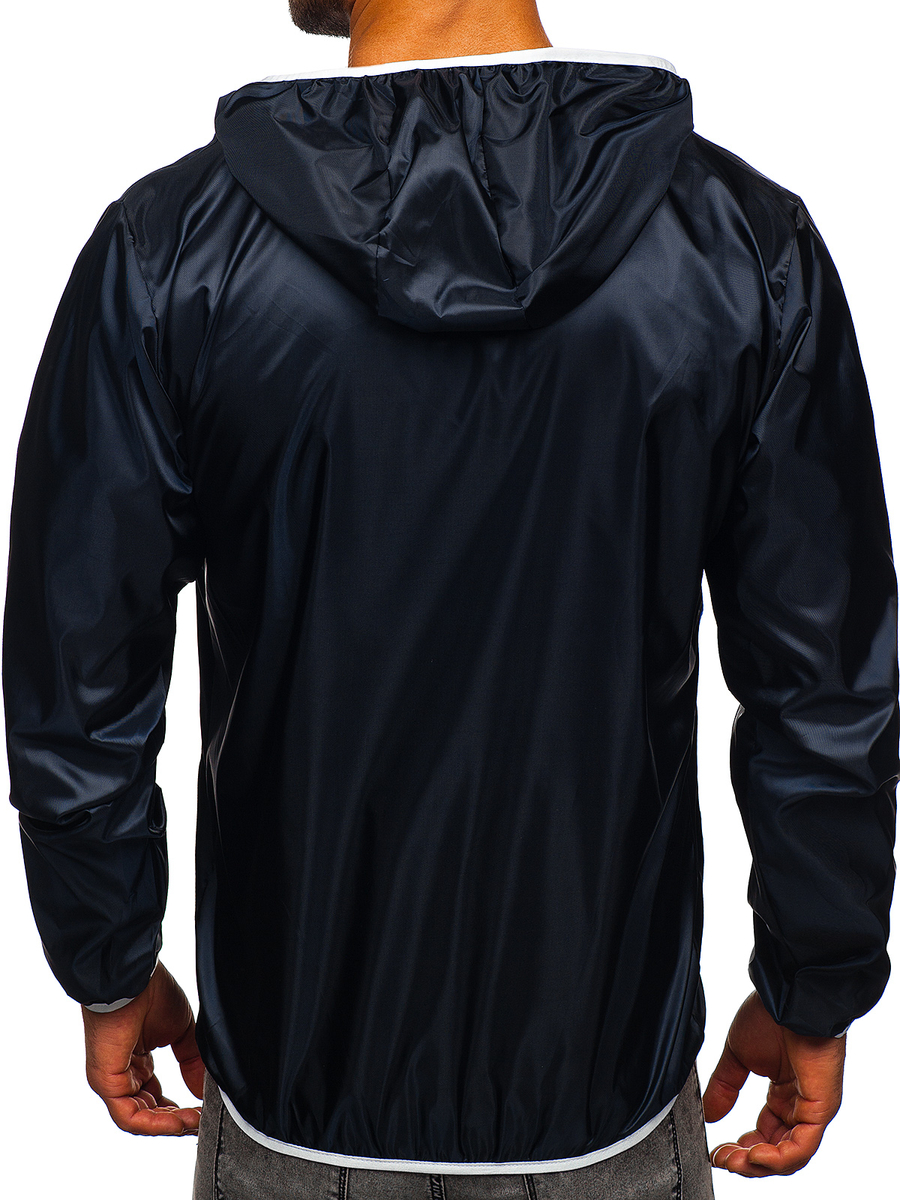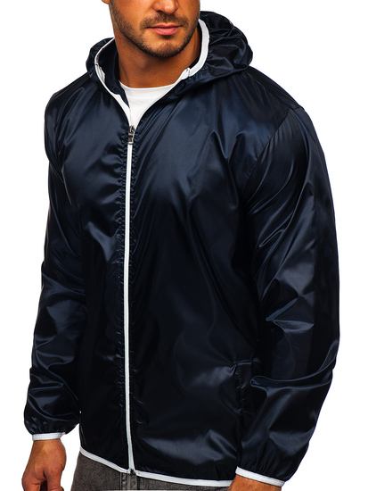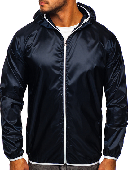 Universal navy blue men's lightweight jacket 5060 from the Bolf collection. It provides great protection against wind and rain. It is made of high-quality 100% polyester. The presented model has got an adjustable hood and two outside pockets. The sleeves are ribbed with an elastic trim.
