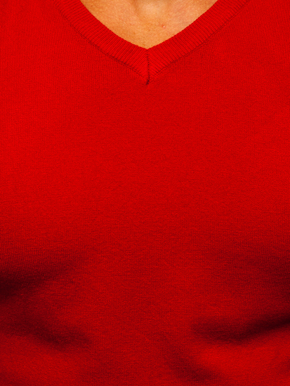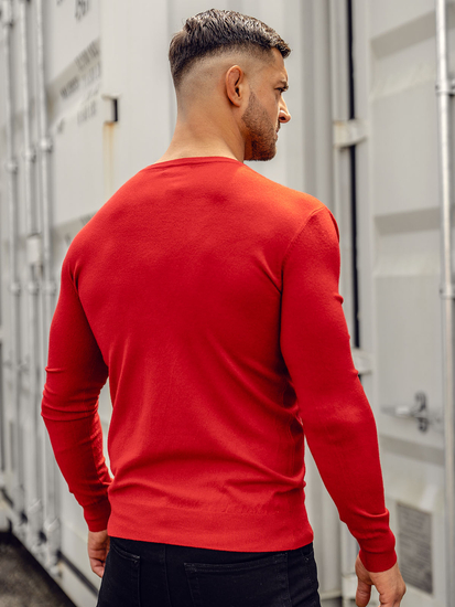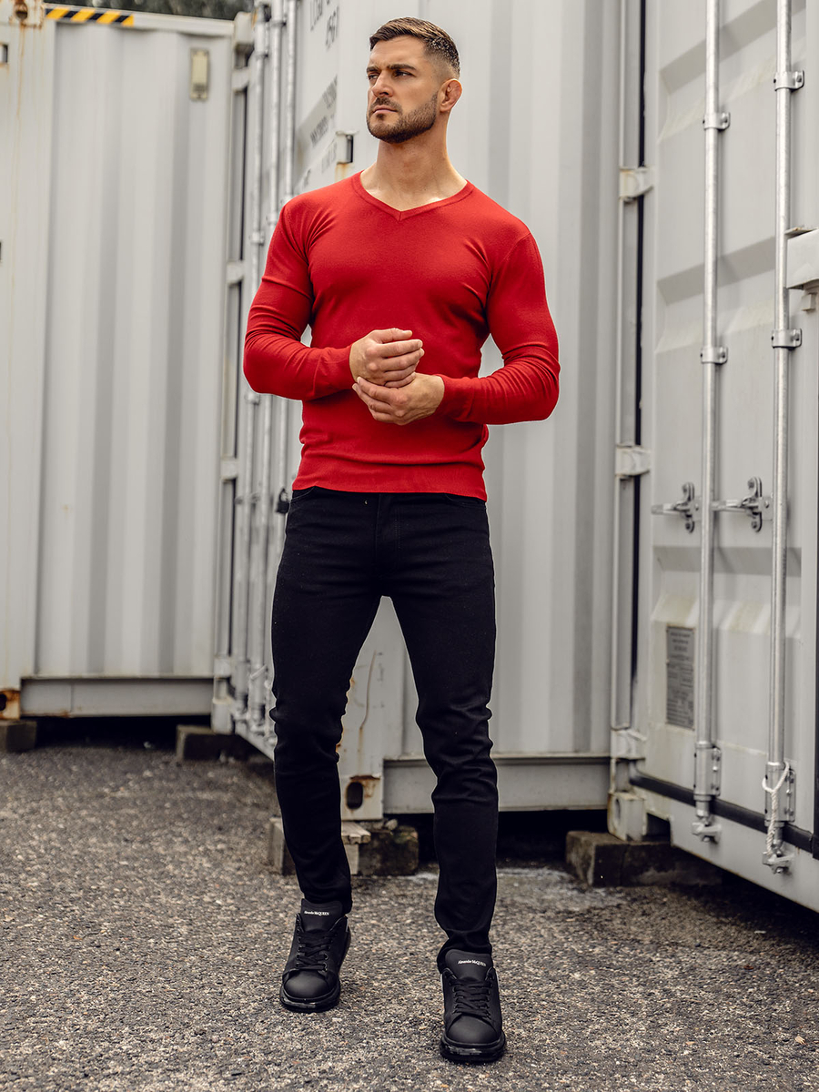 Classic red men's V-neck jumper YY03 from the Bolf collection. The product has a delicate V-neckline with a welt. The ribbing is also finished at the bottom and sleeves, thanks to which the sweater fits every figure. It is made of a delicate, pleasant to the touch fabric that fits perfectly on the body. The material is 32% acrylic, 27% polyester, 23% nylon and 18% viscose. This product model is available in more than ten color variants, you can match it to any styling. Put it on to work, school, cinema, for a walk or meeting with friends - thanks to the wide range of colors, you can look different every day. A classic sweater will perfectly match jeans and a leather jacket, creating the perfect outfit for a city trip. You can pair it with joggers and a sweatshirt for a looser look.