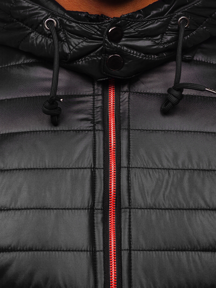 Eye-catching black men's lightweight quilted jacket 6191 from the Bolf collection. There are quiltings on the whole. There is a zip fastening and a stand up collar. It is equipped with ribbed sleeves, hood and bottom. There are two outside zip pockets. It has got a detachable and adjustable hood. It is designed in sport style - perfect for every day. Feel free to use it on a walk, meeting with friends, a night out or shopping. Match it with joggers and a T-shirt or with jeans and a sweater, as well as with a sweatshirt.