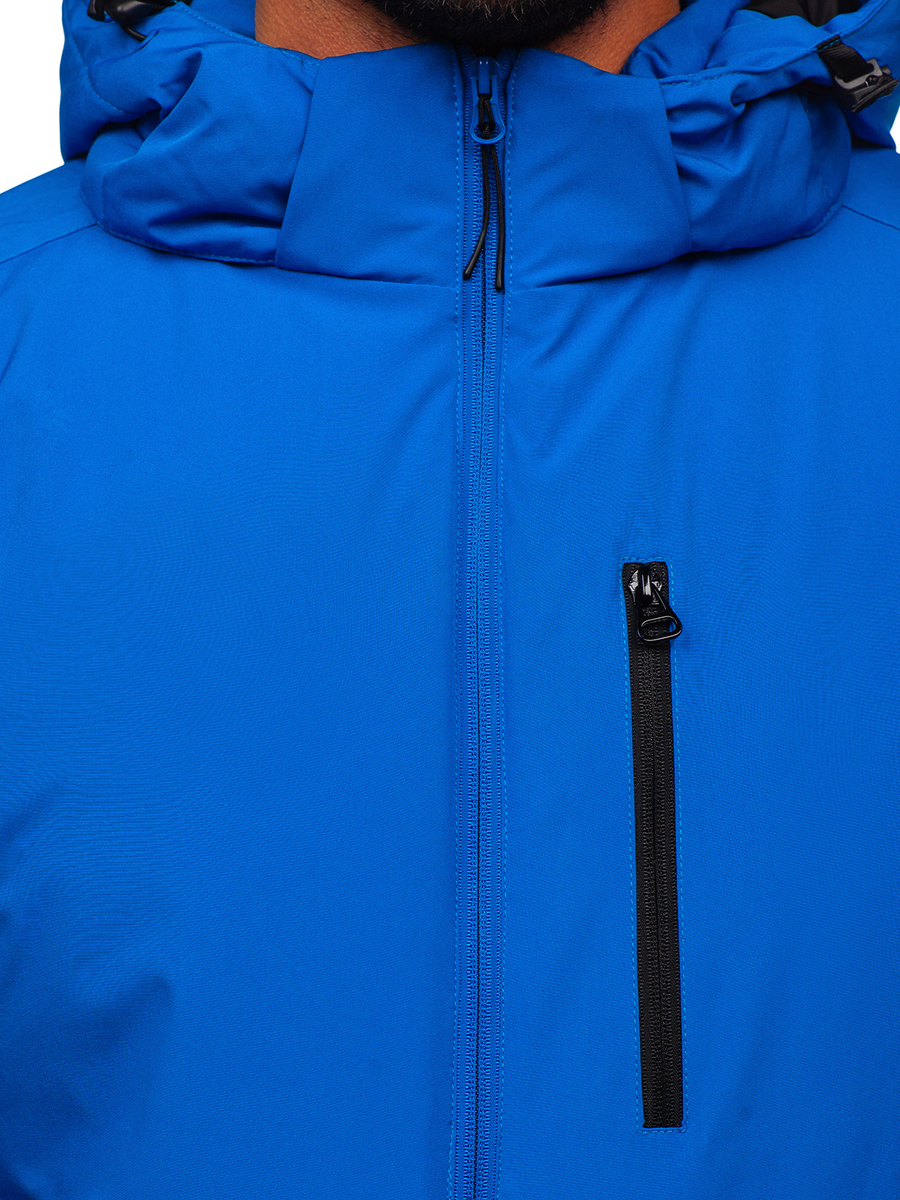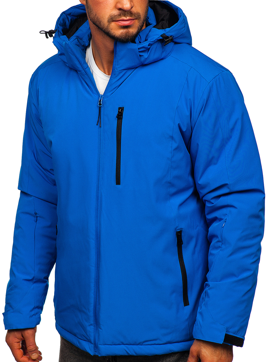 Classic blue men's winter sport jacket HH011 from the Bolf collection. A winter jacket with a hood will suit every taste. The product is fastened with a zipper and a zipper. The hood is removable and has a 2D adjustment. A high collar with a zipper will provide excellent protection against the cold. A practical element of the jacket are pockets: two side zippered, the chest also zippered and two inside pockets, one fastened with Velcro. The sleeves are adjustable with Velcro, from the inside finished with an elastic welt with a thumb hole. The product is universal, it will be perfect for training, walking, going out into the city or hiking in the mountains. It is made of 94% polyester and 6% elastane. It will look great with jeans or sweatpants.