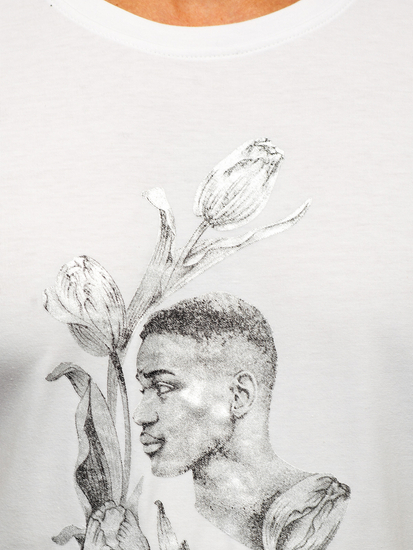 Unique white men's printed T-shirt Y70052 from the Bolf collection. The T-shirt has an unusual print on the front. The product also has a round neckline. It is intended for fans of everyday style. Perfect for trips to the city, meetings with friends and walks. The T-shirt is made of 65% cotton and 35% polyester, thanks to which it is stretchy and adheres perfectly to the body. It will look perfect with jeans or joggers.
