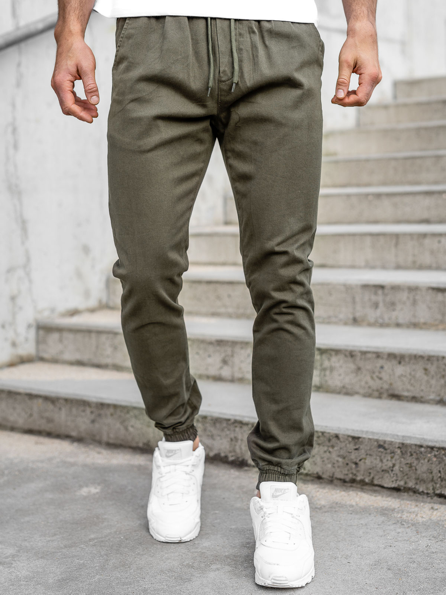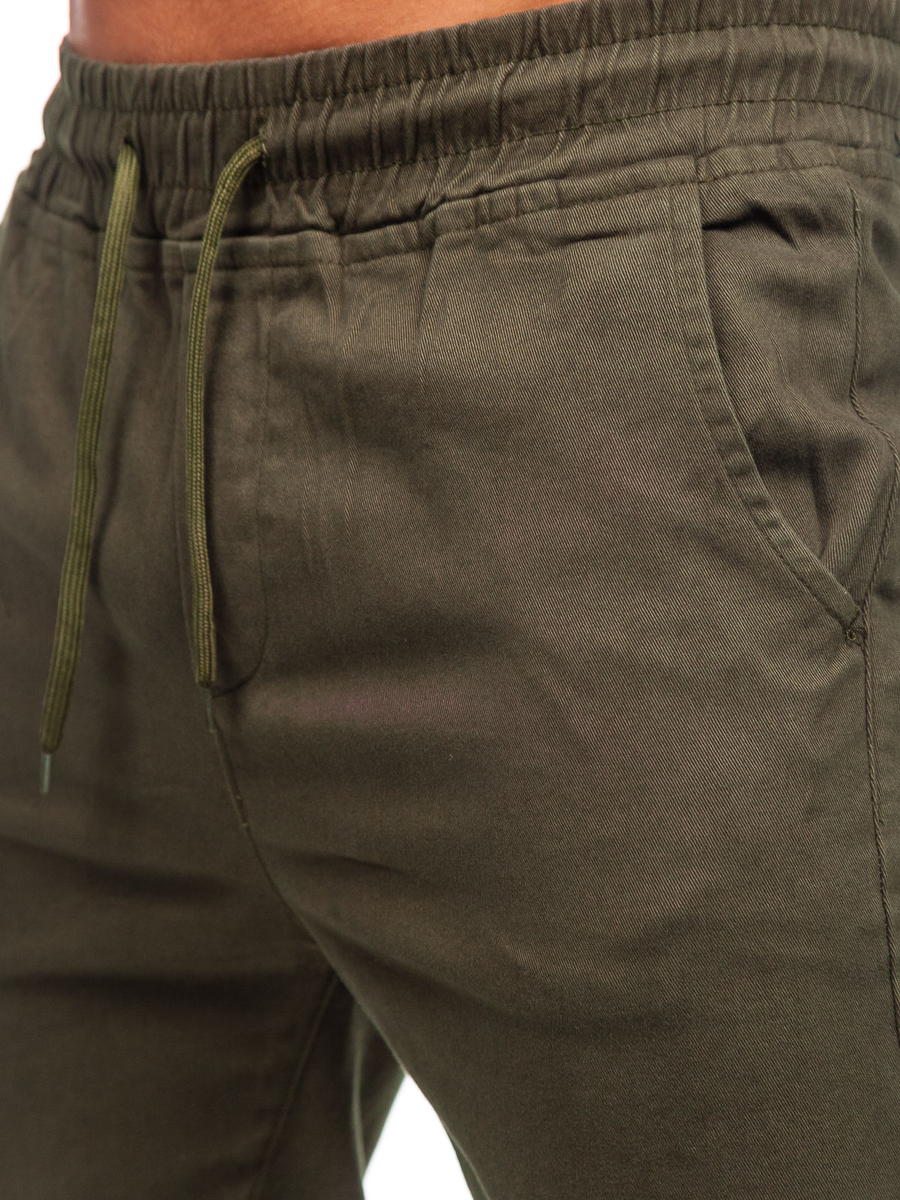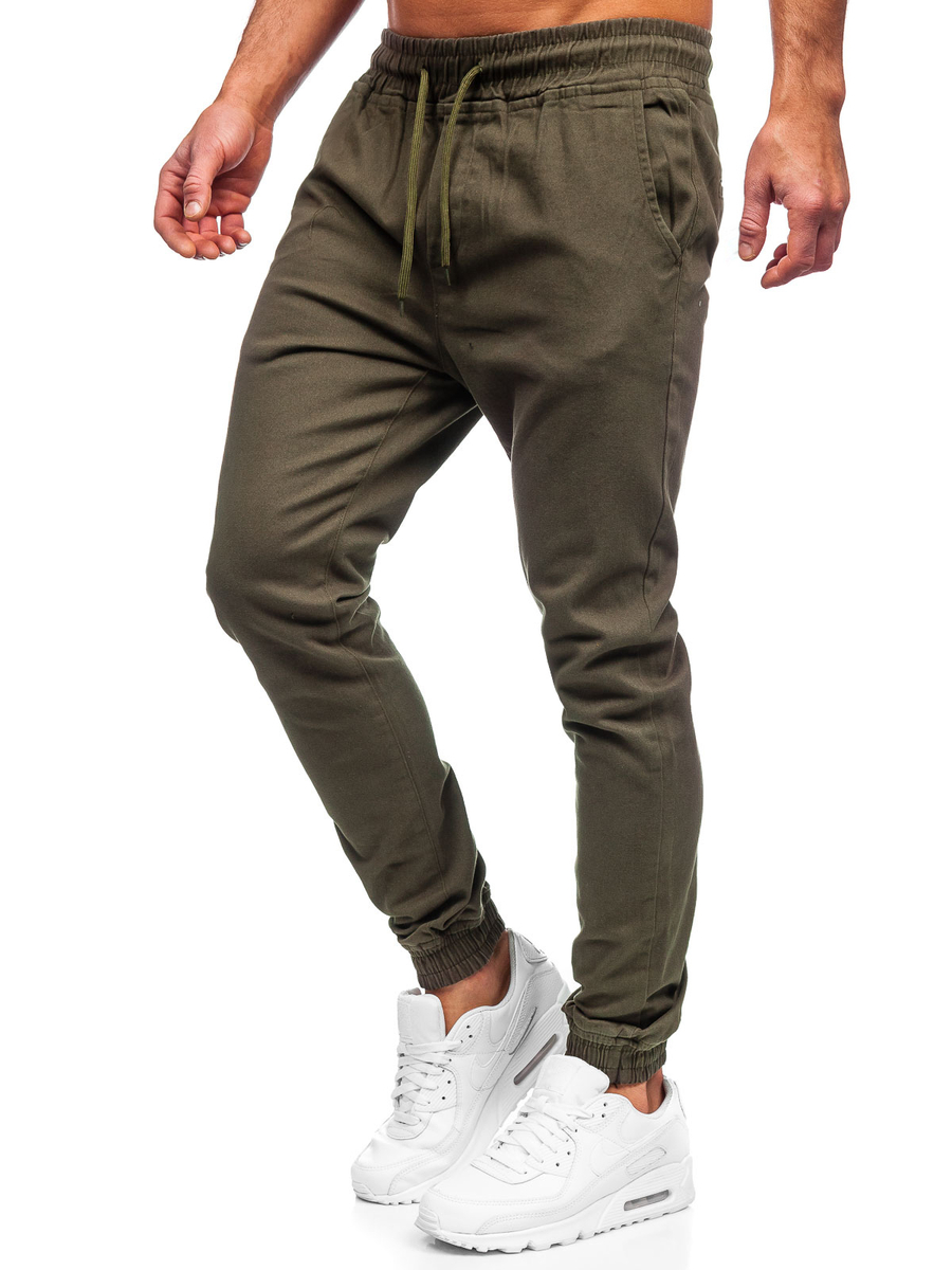 Cool khaki men's joggers 707 from the Bolf collection. Joggers have been very popular in men's fashion for the last few years, now they are a must-have in the wardrobe of every street styling lover. Thanks to the waist adjustment with a strong welt and drawstring, the product will fit every male figure. A practical element are two pockets on the front and two pockets on the back with a button. The legs are finished with a practical welt. Pants are made of 100% cotton. Create a perfect match with a sweatshirt, a long sleeve top or a T-shirt.