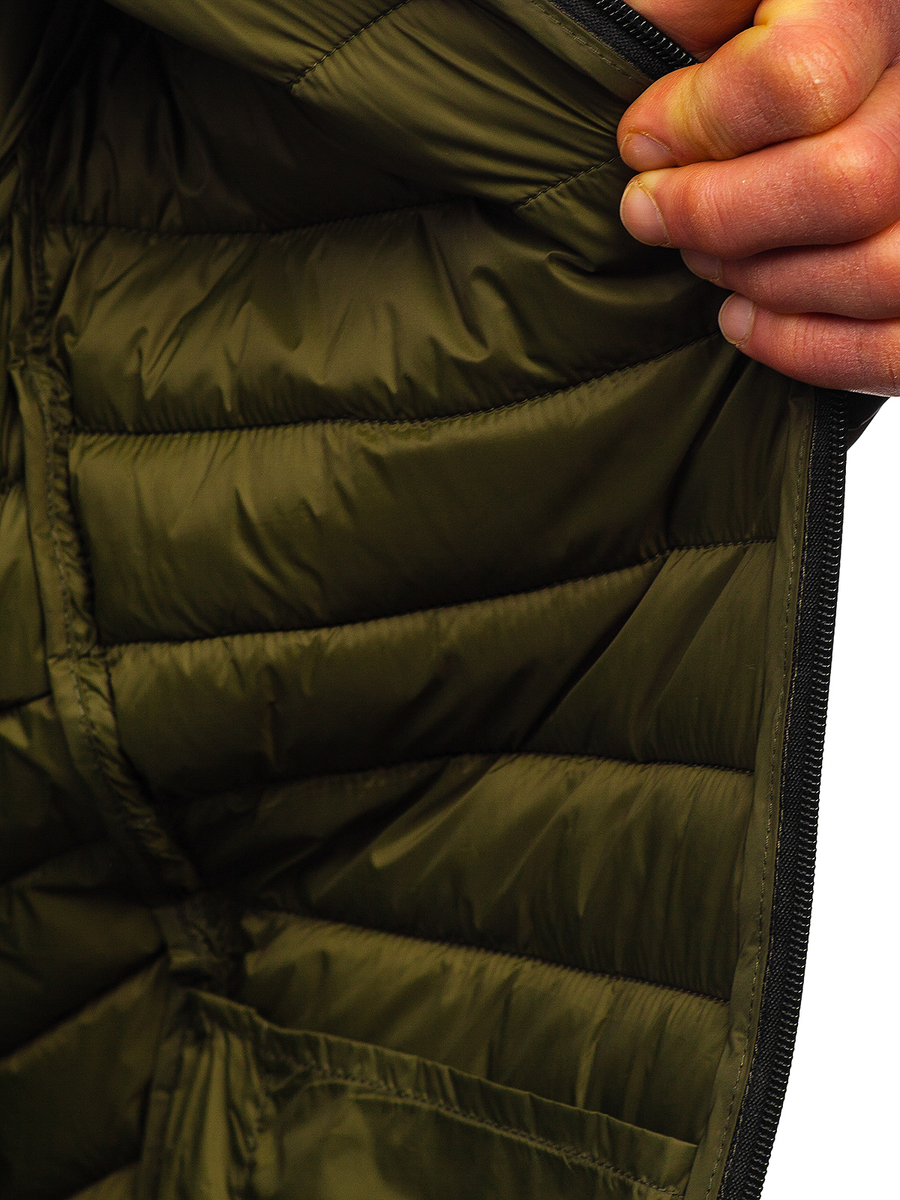 Fantastic green men's lightweight quilted jacket 13021 from the Bolf collection. A comfortable and practical jacket is a must have in the wardrobe of every active man. You can put it on for training or a walk. It is equipped with a zipper. It has an adjustable and non-detachable hood that provides excellent protection against rain or cold. Two zippered pockets are a practical element of the product. The bottom and sleeves are finished with an elastic trim. The jacket is made of 100% nylon, so it is stretchy. It will look perfect with jeans or joggers.