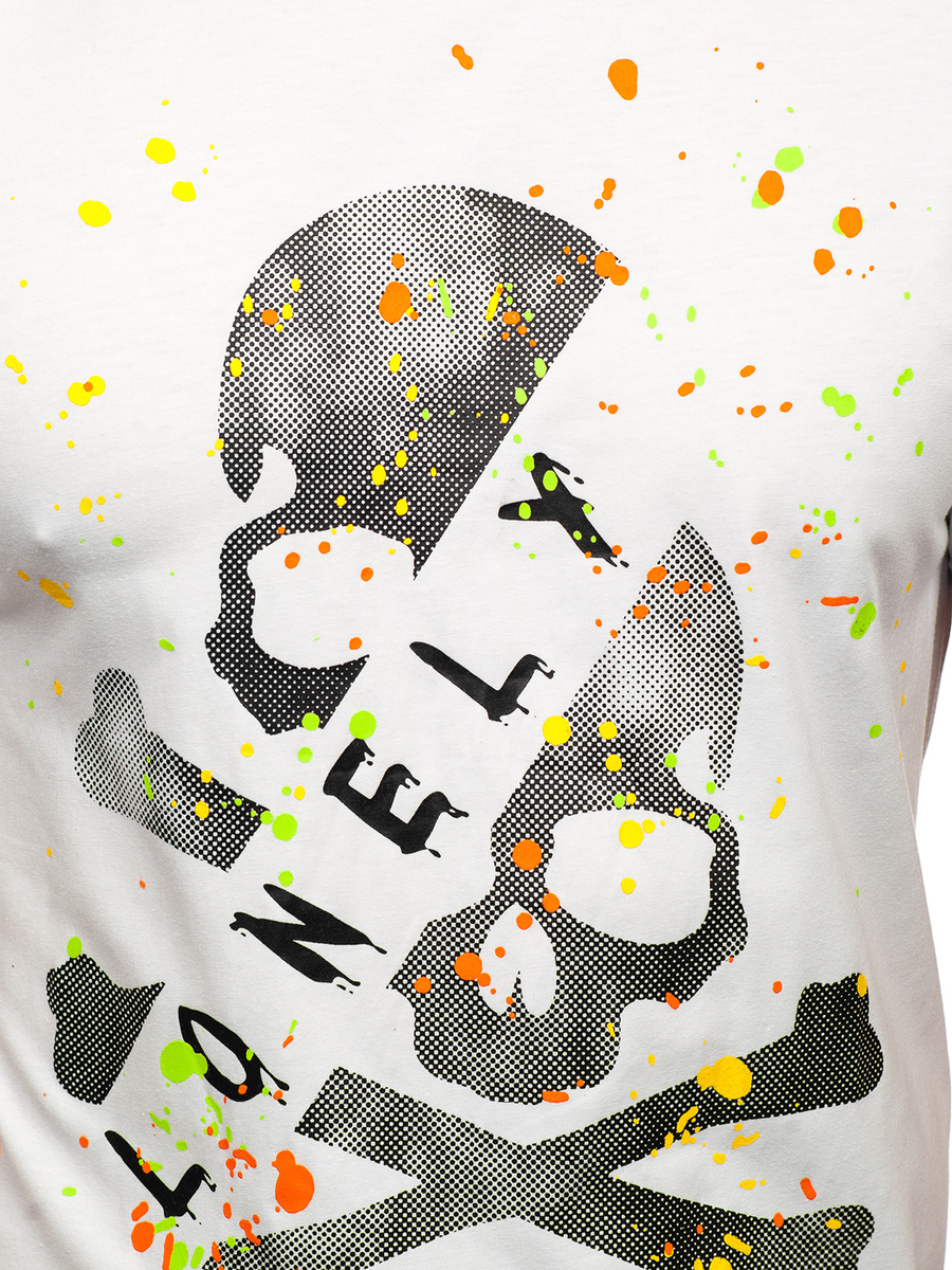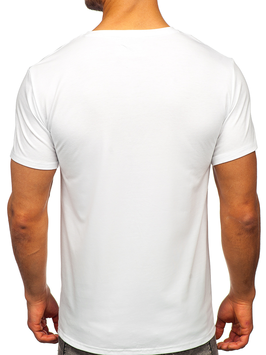 Cool white men's V-neck T-shirt Y70008 from the Bolf collection. It is made of cotton and polyester, which makes it flexible and pleasant to the touch. It will be perfect for trips to the city, meetings with friends or walks. T-shirt in a classic color can be adapted to virtually any styling. The product has a unique and designer print on the front. Create a perfect match with jeans, joggers or sweatpants. Wear it also with a sweatshirt or a gilet.