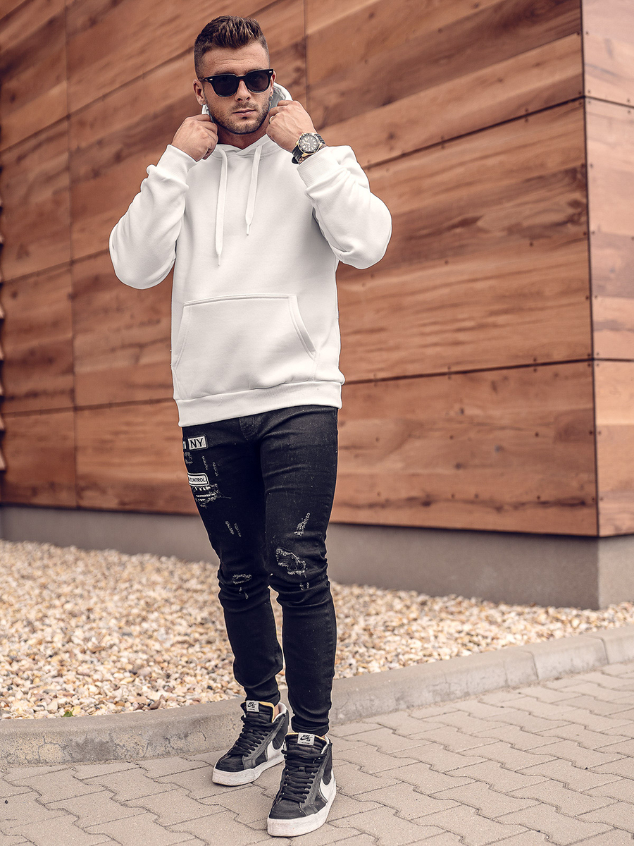 Great white men's hoodie 1004 from the Bolf collection. It has an adjustable hood and a practical kangaroo pocket at the front. The sport look is provided by the straight design. There is a drawstring-adjustable waist and bottom. It is made of soft, smooth sweatshirt fabric in a uniform color. This model is distinguished by rich colors, it can be found in more than twenty color variants, thanks to which it easily fits into many outfits. Wear it all year long. On many occasions. Shopping? Relax? Even for a spontaneous date, it will be appropriate. The product is perfect for everyday wear, it is a must-have item in any stylish men's wardrobe. The stylish colour really boosts up the outfit. It works well with jeans, cargo trousers or joggers. Match it with sweatpants or a lightweight jacket. Wear it to the gym or on an outdoor workout. This model is often chosen by buyers. Check out this model in the reviews of influencers and IG. It attracts with great workmanship and a good price compared to the competition. The sweatshirt also has its counterpart in the women's version, which also breaks popularity records.