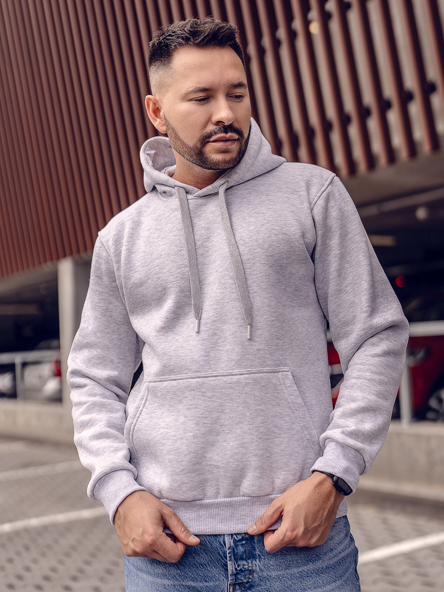 Great light grey men's hoodie 1004 from the Bolf collection. It has an adjustable hood and a practical kangaroo pocket at the front. The sport look is provided by the straight design. There is a drawstring-adjustable waist and bottom. It is made of soft, smooth sweatshirt fabric in a uniform color. This model is distinguished by rich colors, it can be found in more than twenty color variants, thanks to which it easily fits into many outfits. Wear it all year long. On many occasions. Shopping? Relax? Even for a spontaneous date, it will be appropriate. The product is perfect for everyday wear, it is a must-have item in any stylish men's wardrobe. The stylish colour really boosts up the outfit. It works well with jeans, cargo trousers or joggers. Match it with sweatpants or a lightweight jacket. Wear it to the gym or on an outdoor workout. This model is often chosen by buyers. Check out this model in the reviews of influencers and IG. It attracts with great workmanship and a good price compared to the competition. The sweatshirt also has its counterpart in the women's version, which also breaks popularity records.