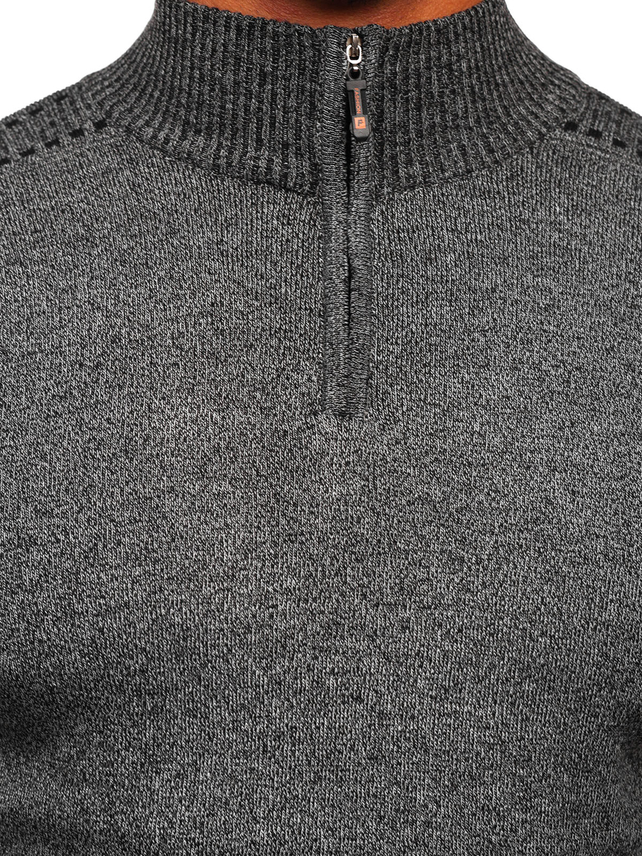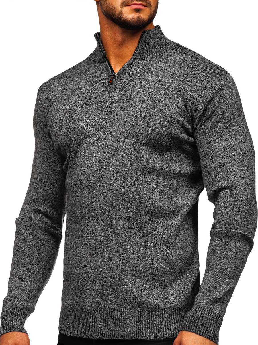 Classic graphite men's stand up jumper S8279 from the Bolf collection. The product has a delicate stand-up collar, fastened with a zipper. The bottom and sleeves are finished with a welt, thanks to which the sweater fits perfectly to every figure, remaining extremely comfortable. It is made of 35% cotton, 60% polyester and 5% elastane. This product model comes in three color variants, so you will definitely choose one for yourself. Put it on to work, school, for a walk or meeting with friends - it will work great, whatever the occasion. A classic sweater will go great with chinos and a leather jacket, creating the perfect outfit for meeting friends. You can pair it with jeans and a bomber jacket to create a cooler look for an evening walk.