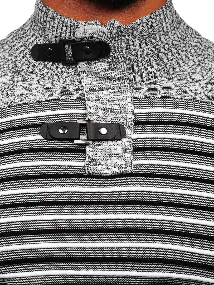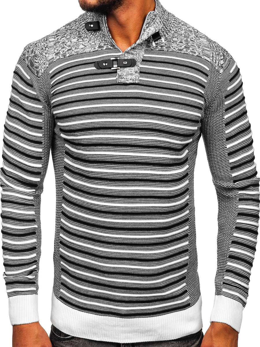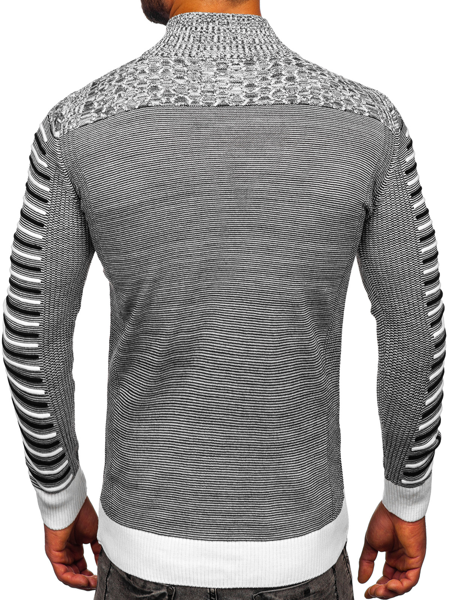 Classic white men's stand up jumper 1028 from the Bolf collection. The product has a delicate stand-up collar, fastened with a zipper and press studs. The bottom, neckline and sleeves are finished with a welt, thanks to which the sweater adapts to every figure, remaining extremely comfortable. It was made of 50% wool and 50% acrylic. This product model comes in four color variants, so you will definitely choose one for yourself. Fashionable stripes add character to it. Thanks to the subdued colors, the sweater will perfectly match lighter and darker outfits. Put it on to work, school, for a walk or meeting with friends - it will work great, whatever the occasion. You can pair it with joggers and a bomber jacket to create a looser look for an evening walk. A classic sweater will go great with chinos and a leather jacket, creating the perfect outfit for meeting friends.