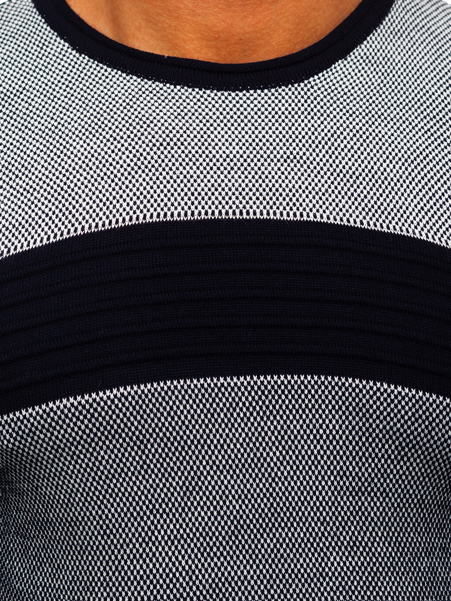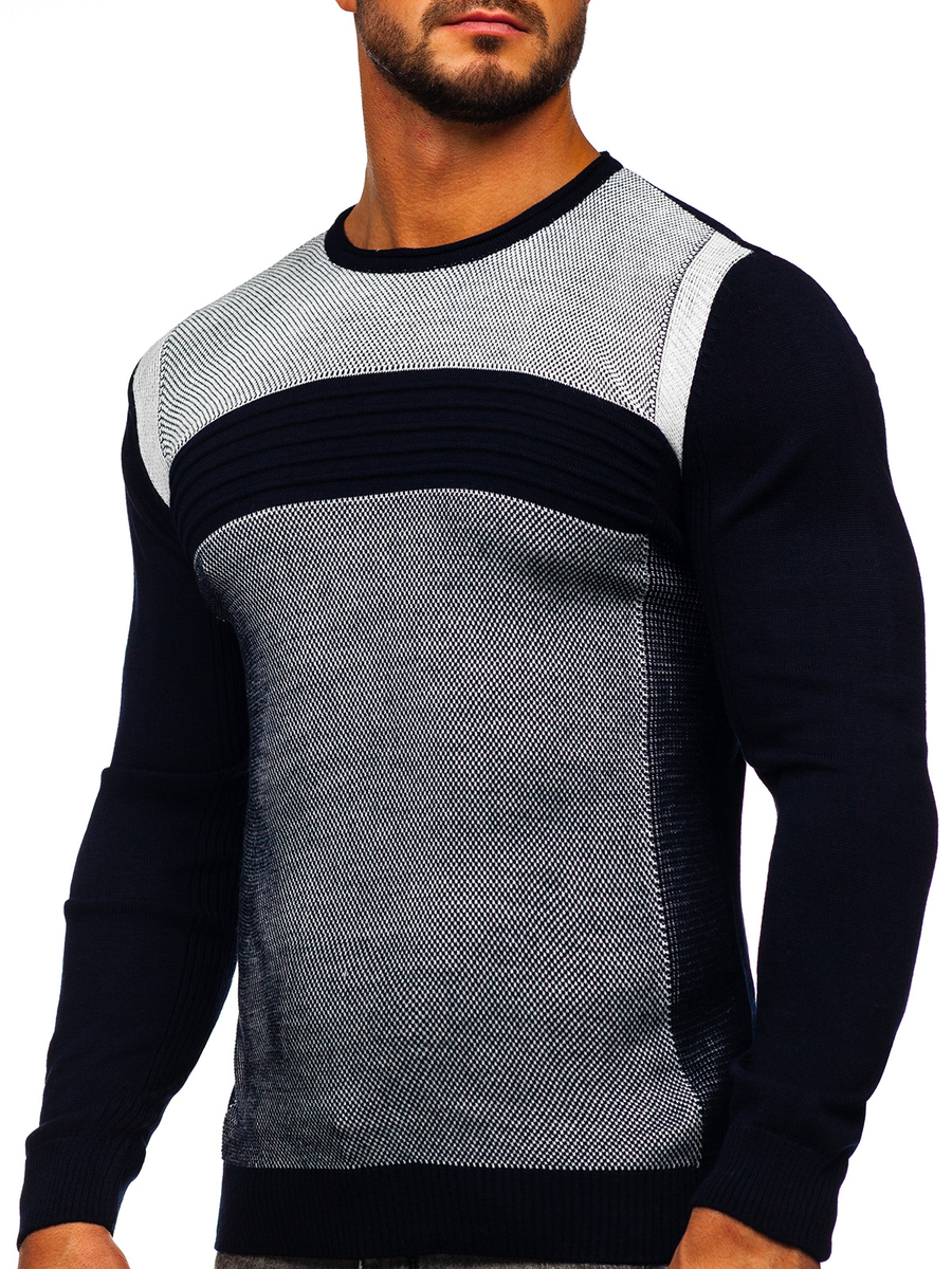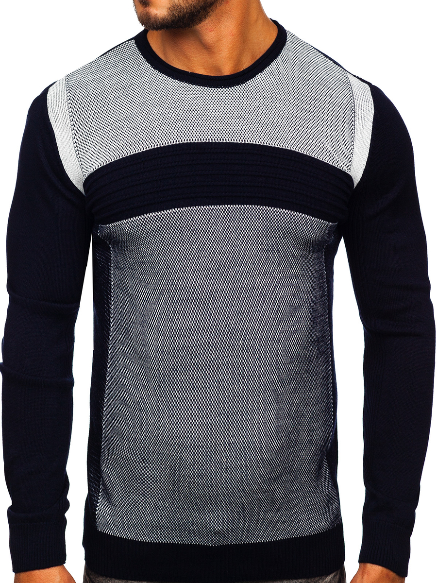 Classic navy blue men's jumper 1020 from the Bolf collection. The product has a round neckline, which is finished with a welt. The ribbing is also finished at the bottom and sleeves, thanks to which the sweater fits every figure. It is made of a delicate, pleasant to the touch fabric that fits perfectly on the body. The material is 50% wool and 50% acrylic. This product model is available in three subdued colors, so you can match it to any styling. Wear it to work, school, cinema, for a walk or meeting with friends. A classic sweater will go great with jeans and a leather jacket, creating the perfect outfit for a city trip. You can pair it with joggers and a sweatshirt for a looser look.
