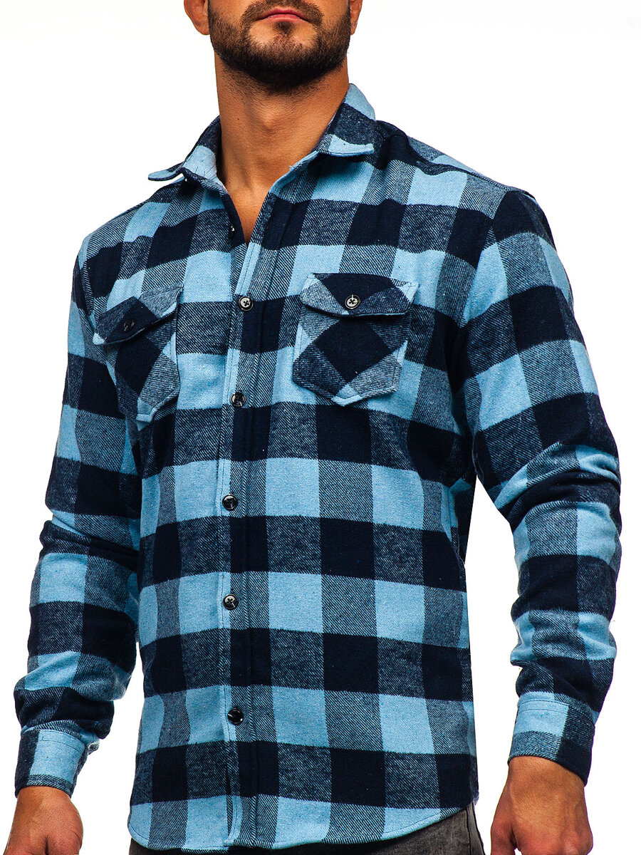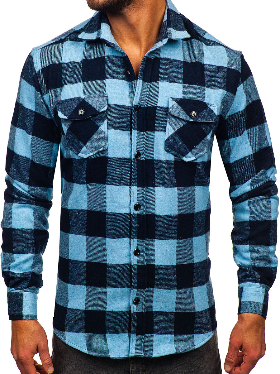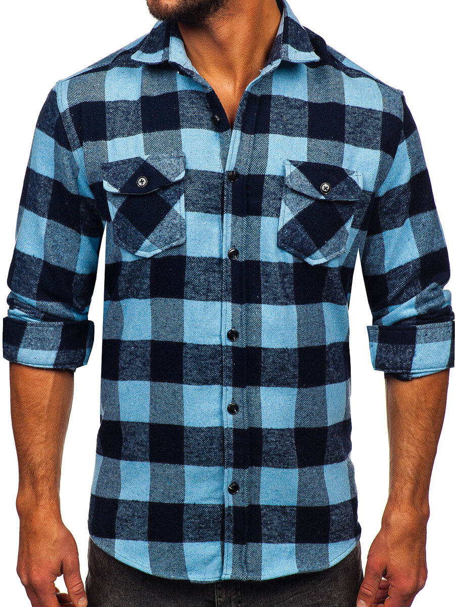 Eye-catching sky blue men's long sleeve flannel shirt 20723 from the Bolf collection. The shirt has two stylish pockets fastened with a button. The bottom of the shirt is rounded. The product has cuffs that are also fastened with a button.This type of shirt will be perfect for any occasion. You can dress her up for a date, a city trip, or a spontaneous meeting with friends. The product is universal and can be combined with any item of clothing. It is made of 65% cotton and 35% polyester, which makes it pleasant to touch and flexible. It works well with jeans or joggers.