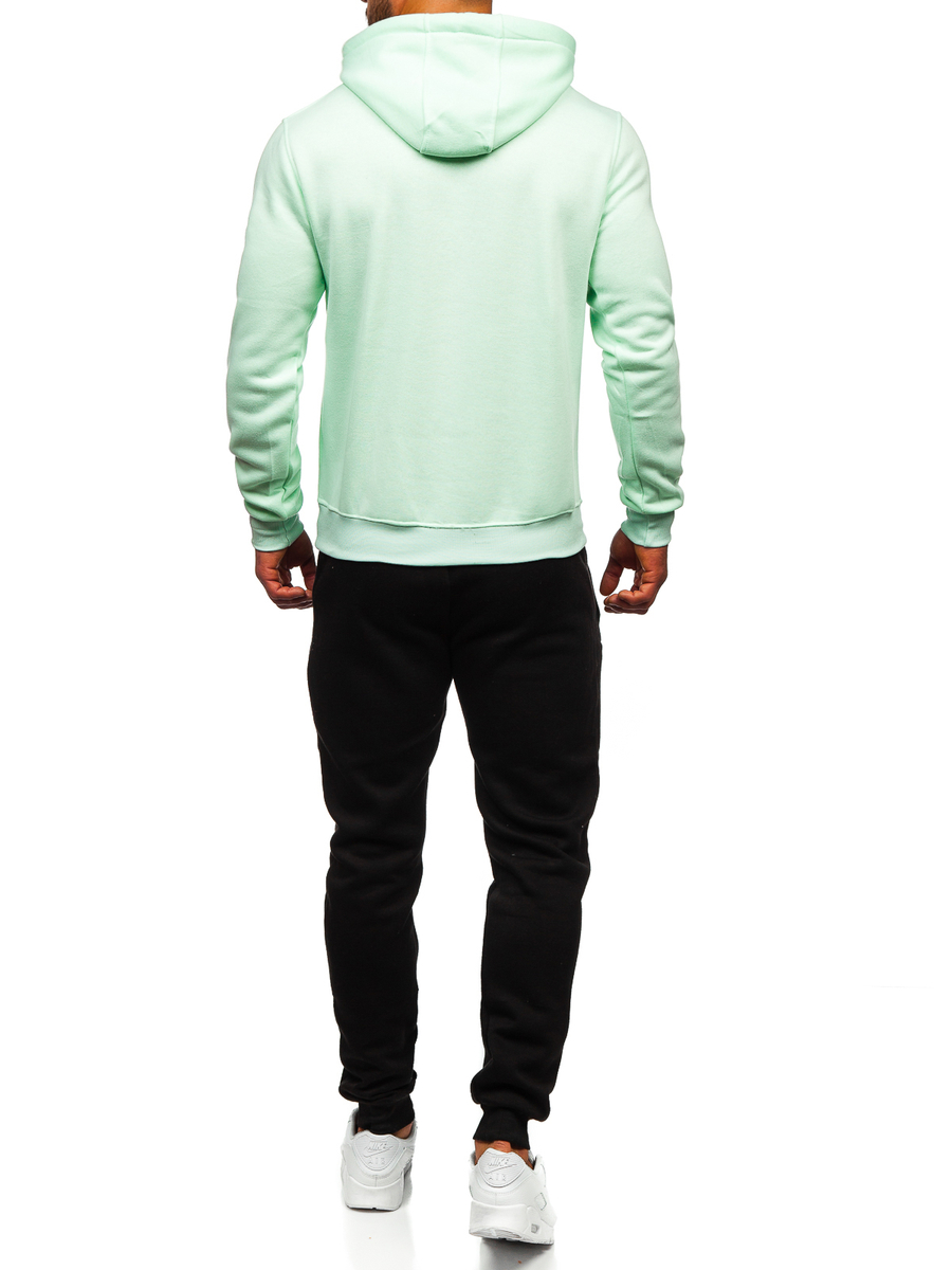 Fantastic mint sport men's tracksuit D002 from the Bolf collection. The set includes a sweatshirt and sweatpants. The hoodie has a timeless kangaroo pocket. The pants are adjustable at the waist with a strong welt and drawstring, and have two pockets on the sides. A simple, fitted cut gives them a sporty look. It was made of a soft and pleasant in touch fabric. A tracksuit set can be a universal base for building everyday or sports stylizations. Both the sweatshirt and pants can be combined with other items of clothing, thus obtaining many possibilities for creating everyday stylizations. The set will perfectly match a T-shirt, a lightweight jacket or a sport jacket. Sweatsuits are recommended to be worn at home, on a walk, while shopping, or during sports in the gym or outdoors.