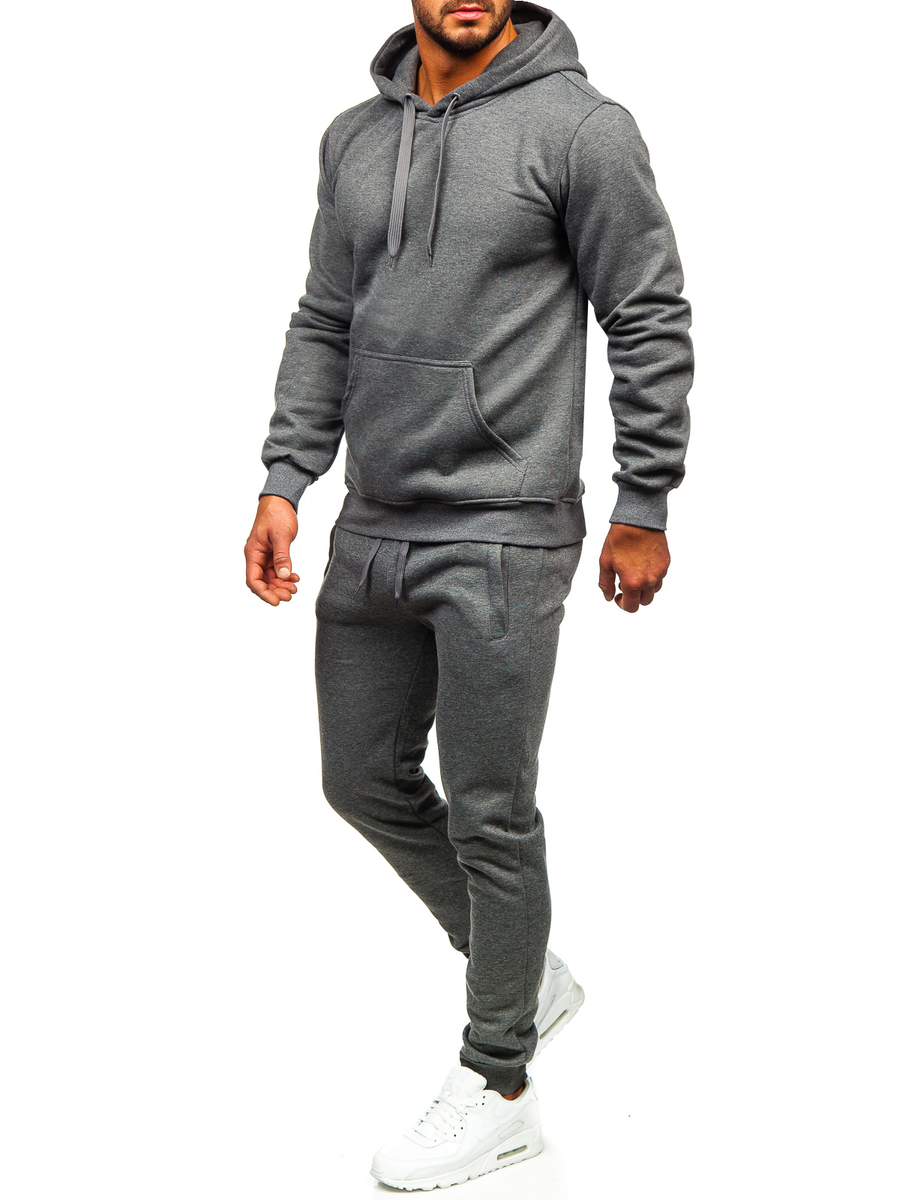 Fantastic anthracite sport men's tracksuit D003 from the Bolf collection. The set includes a short hoodie and sweatpants. The pants are adjustable at the waist with a strong welt and drawstring, and two pockets on the sides. A simple, fitted cut gives them a sporty look. It was made of a soft and pleasant in touch fabric. A tracksuit set can be a universal base for building everyday or sports stylizations. Both the sweatshirt and pants can be combined with other items of clothing, thus obtaining many possibilities for creating everyday stylizations. The set will perfectly match a T-shirt, a lightweight jacket or a sport jacket. Sweatsuits are recommended to be worn at home, on a walk, while shopping, or during sports in the gym or outdoors.
